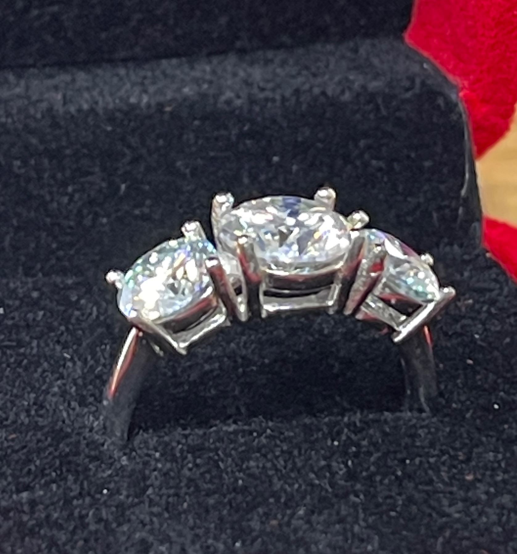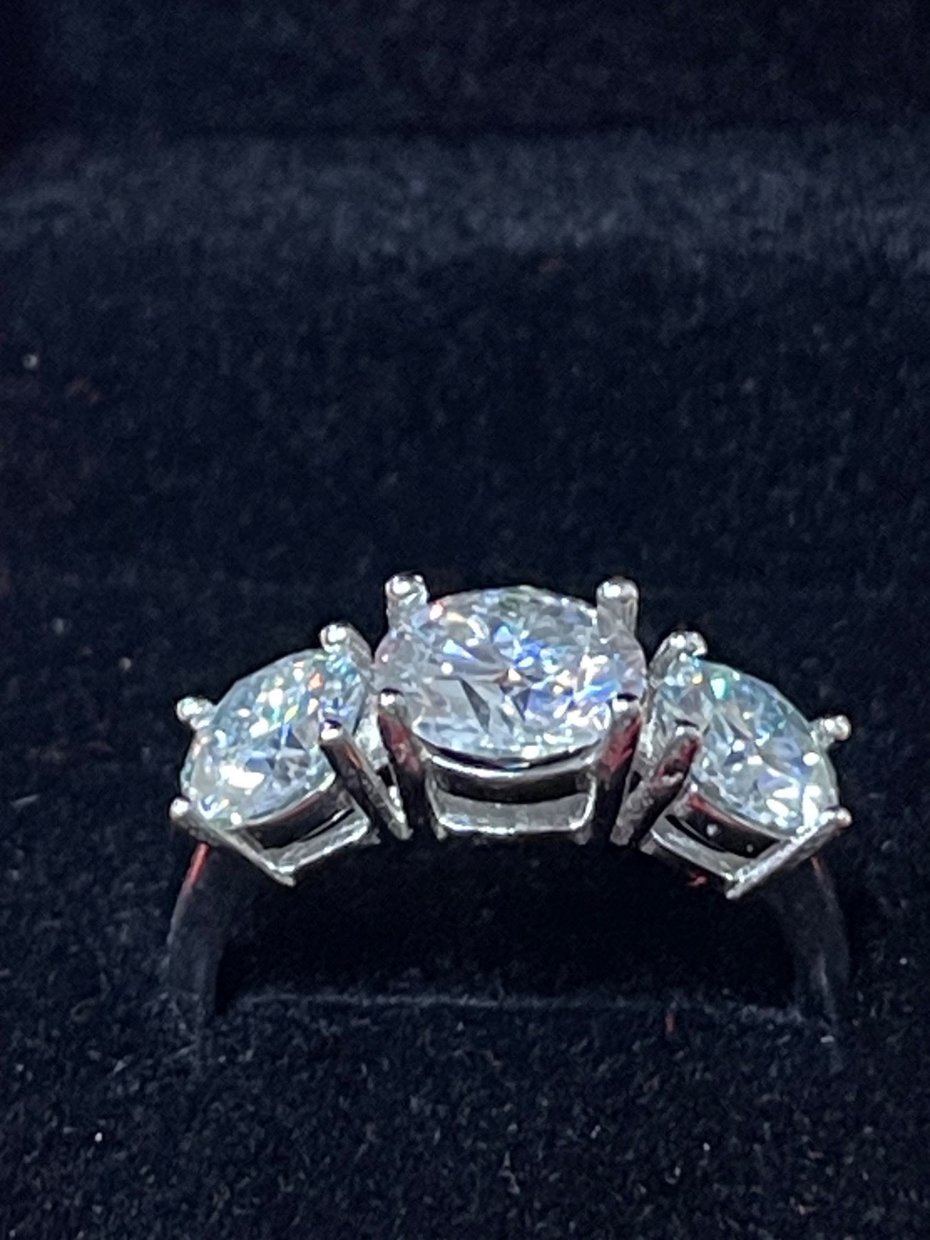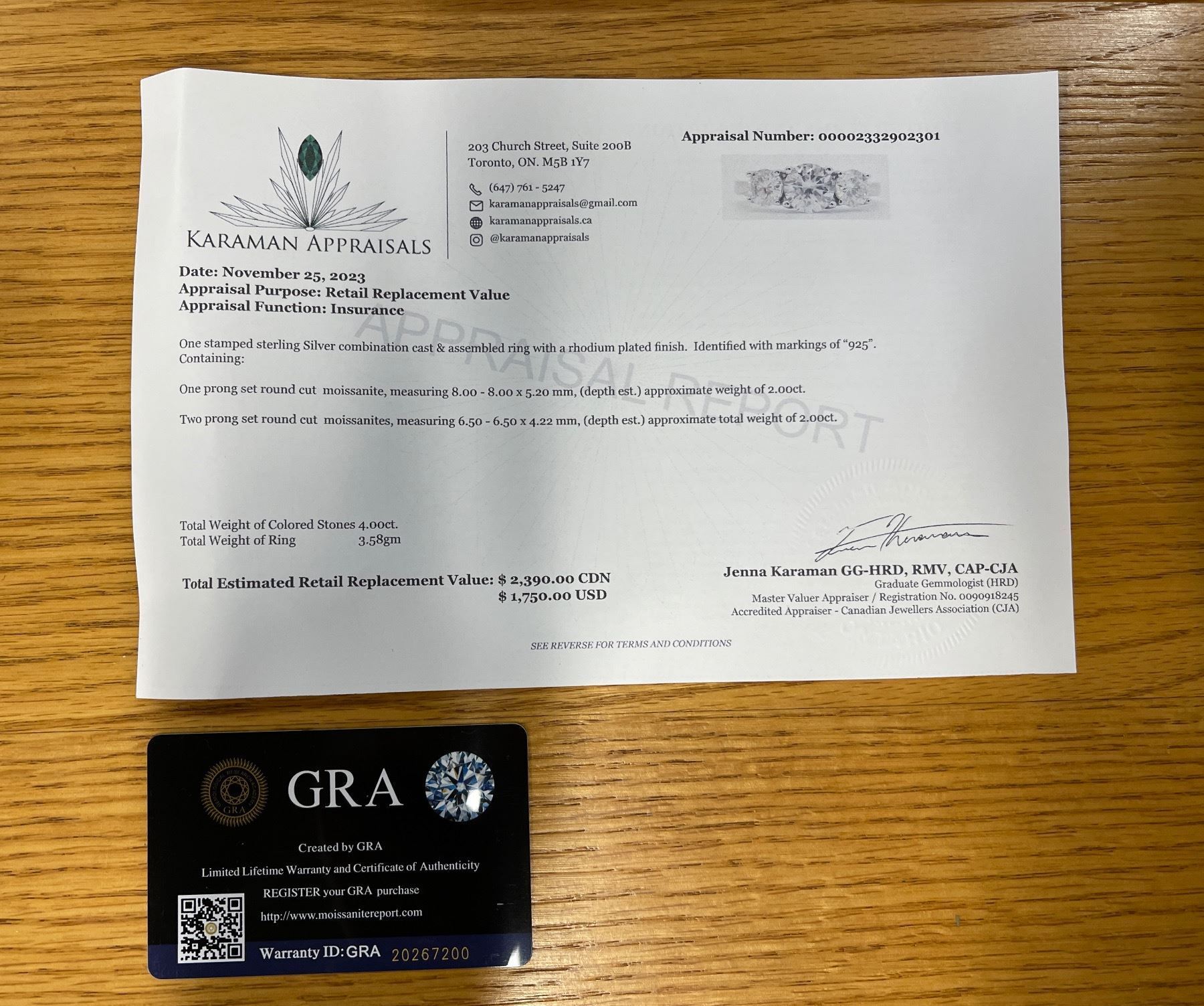 4.00 CT TW GRA CERTIFIED MOISSANITE VVS D COLOR WITH 2.00 CT IN CENTER WITH 1.00 CT MOISSANITE ON EITHER SIDE SET IN STERLING SILVER RETAIL REPLACEMENT VALUE $2,390.00