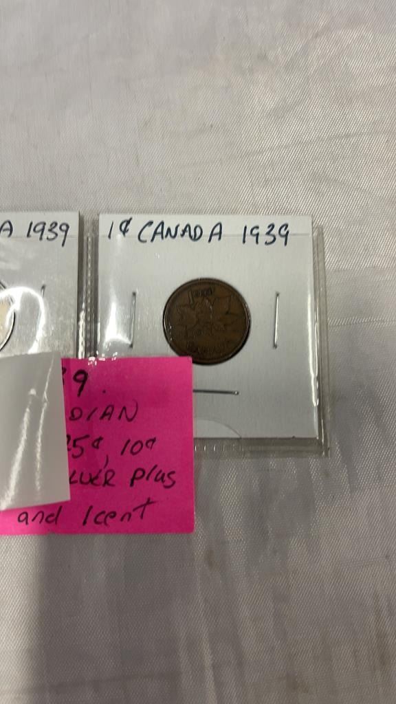 4 - 1939 CANADIAN COINS 25 CENT AND 10 CENT .800 SILVER PLUS 5 CENT AND 1 CENT