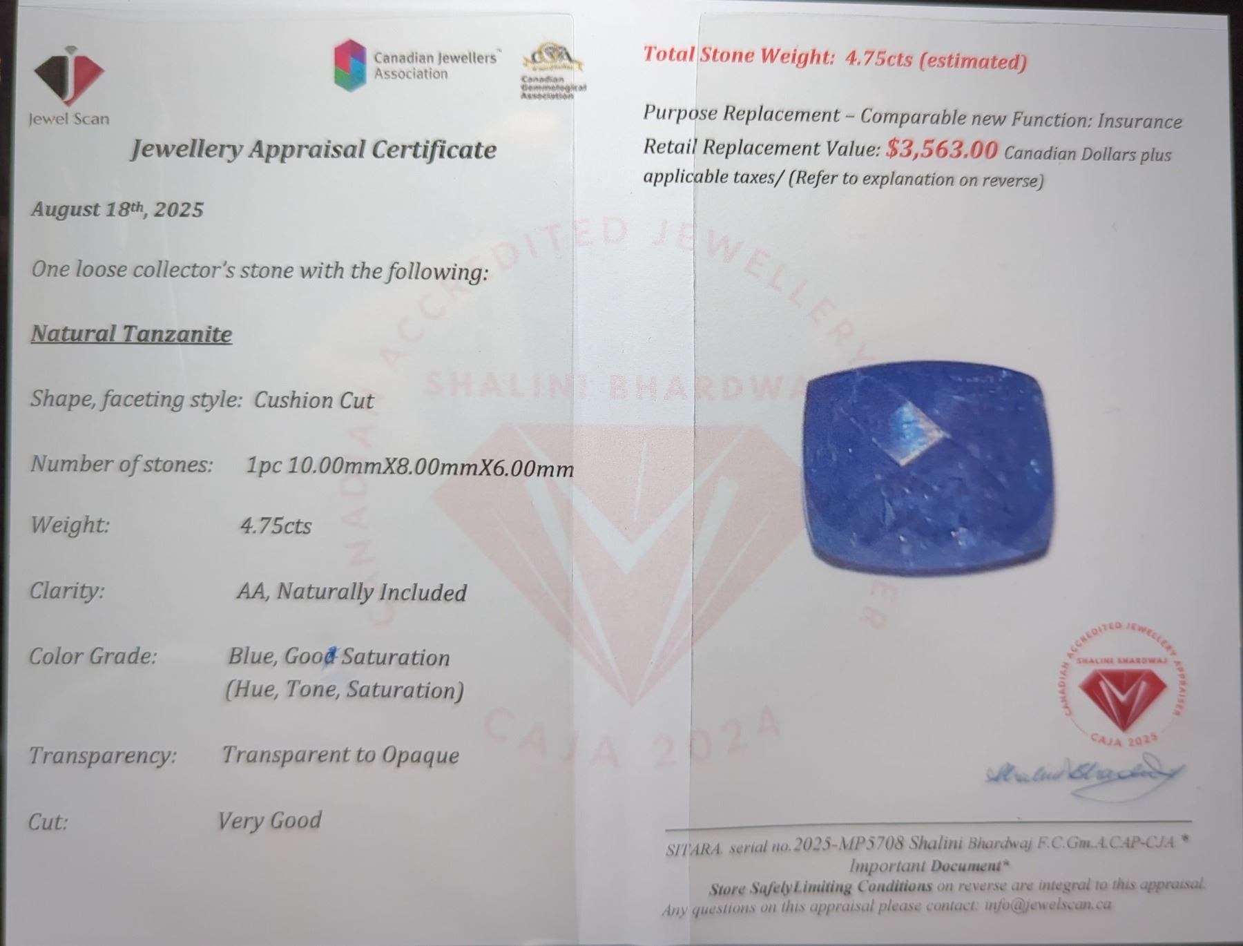 4.74 ct Certified Purp/Blue Tanzanite gemstone ($3,563 Appraisal)