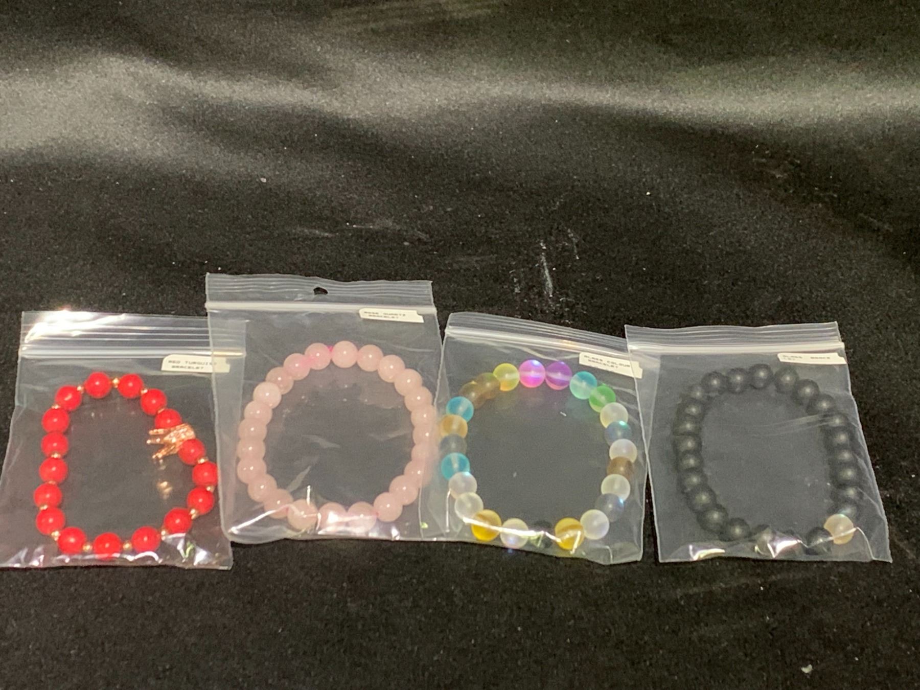 4 ASSORTED BRACELETS; GLASS, ROSE QUARTZ AND RED TURQUOISE