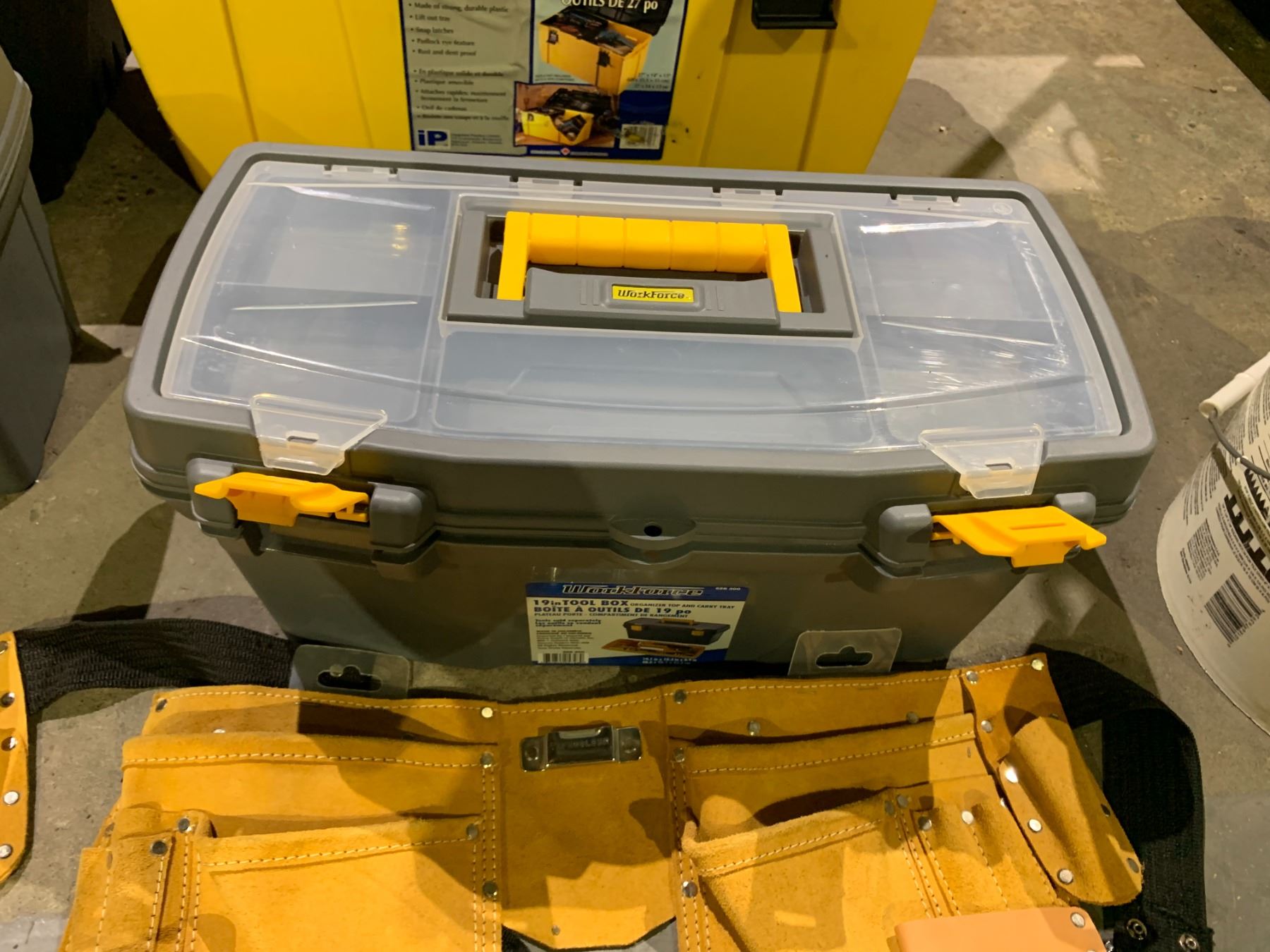4 ASSORTED TOOLBOXES WITH ASSORTED CONTENTS INCLUDING; PLUMBING HOSE, DOOR PARTS, NEW TOOLBELTS & MORE