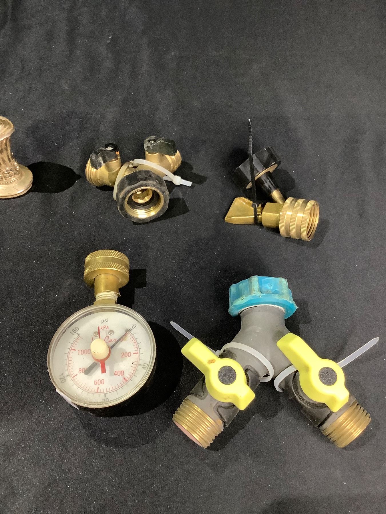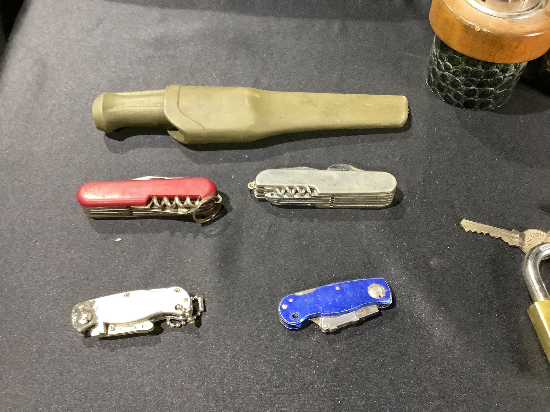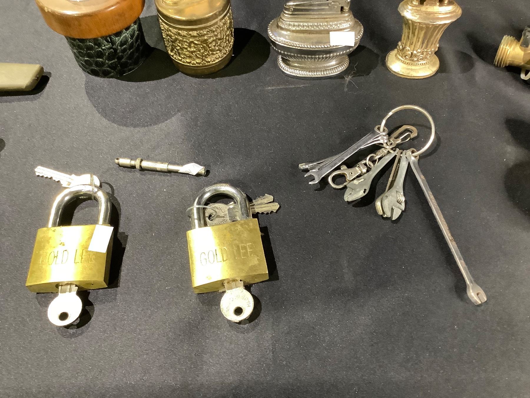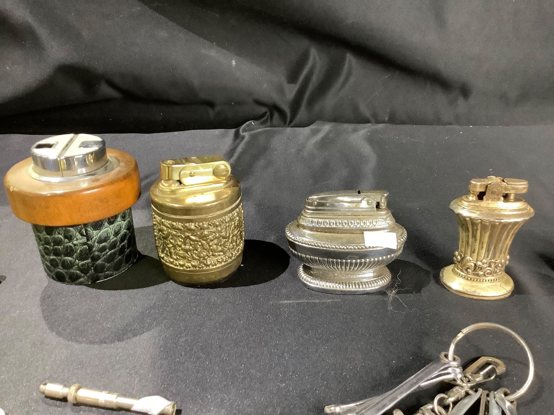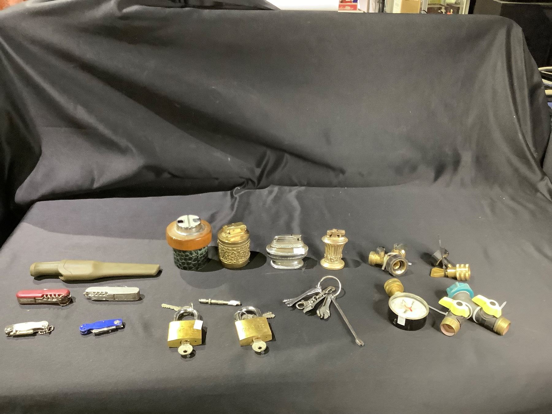 4 ASSORTED VINTAGE TABLE LIGHTERS & BIN OF ASSORTED ITEMS INCLUDING; KNIVES, PRESSURE GAUGE, WRENCHES & MORE