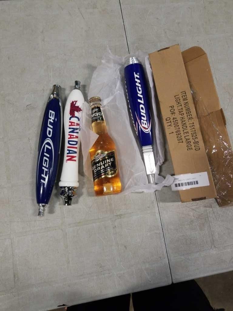 4 BEER TAP HANDLES - 2 BUD LIGHT, MOLSON CANADIAN AND MILLER GENUINE DRAFT BOTTLE TAP