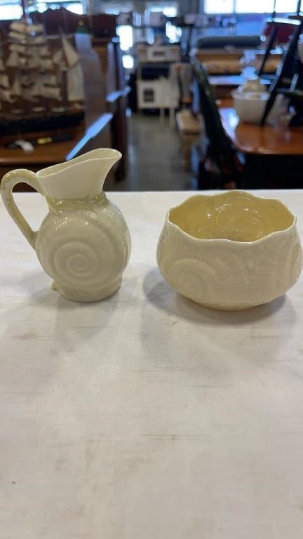 4 BELLEEK IRELAND CHINA LIMPET CUPS AND SAUCERS, AND TOY SHELL CREAM AND SUGAR