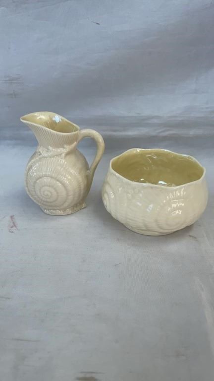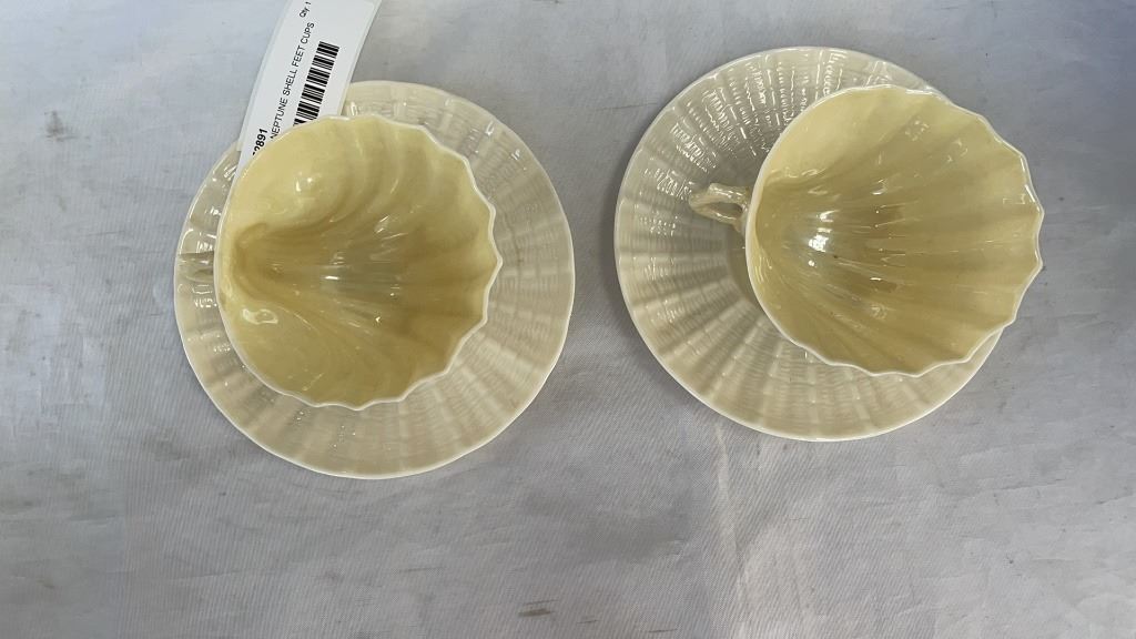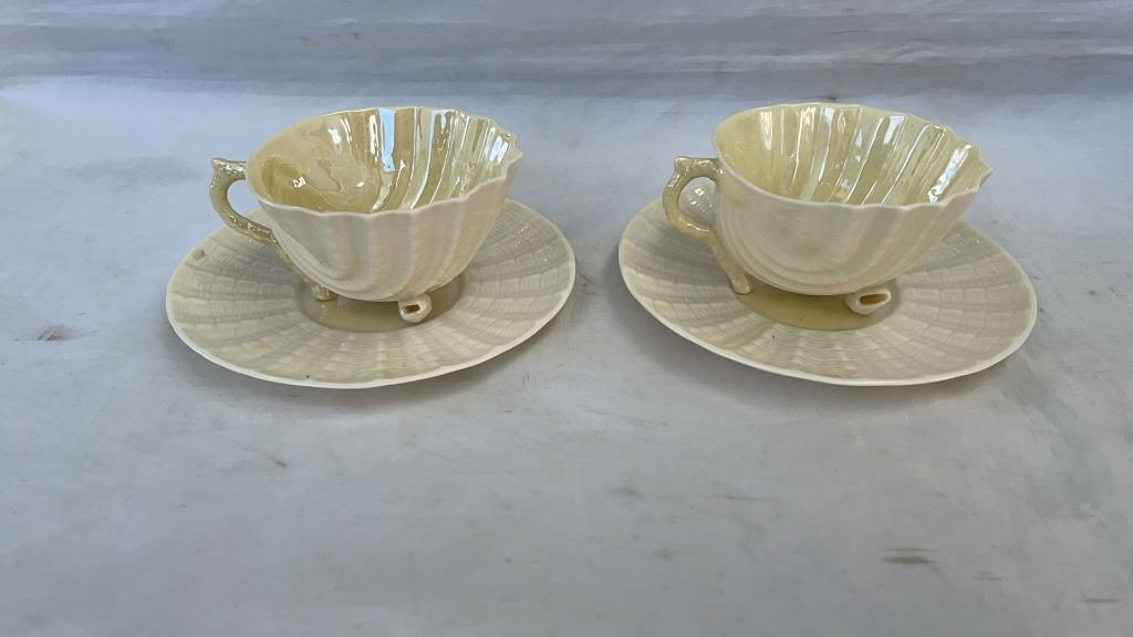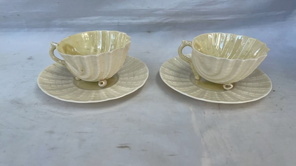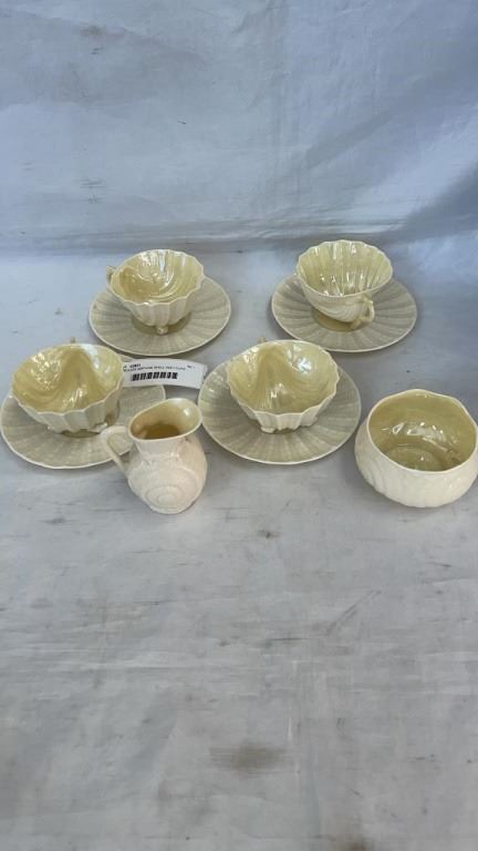 4 BELLEEK IRELAND CHINA NEPTUNE SHELL FEET CUPS AND SAUCERS, AND TOY SHELL CREAM AND SUGAR