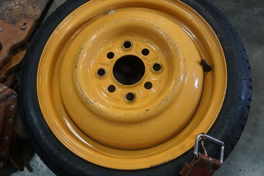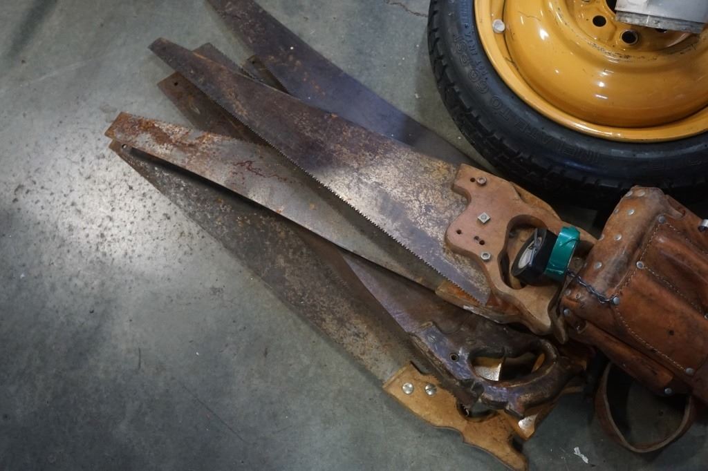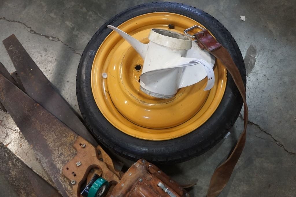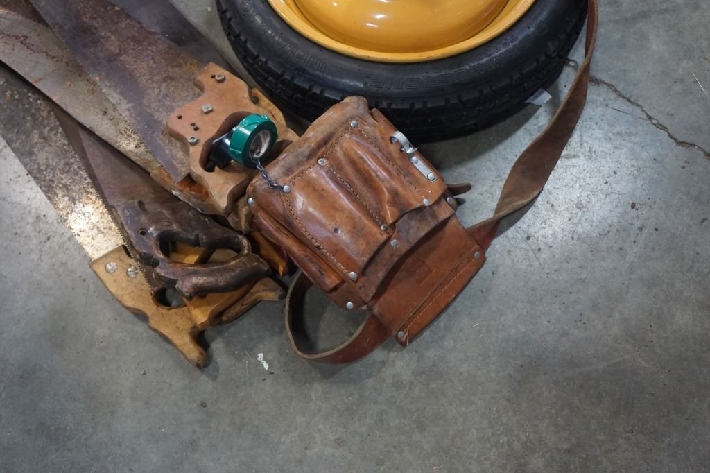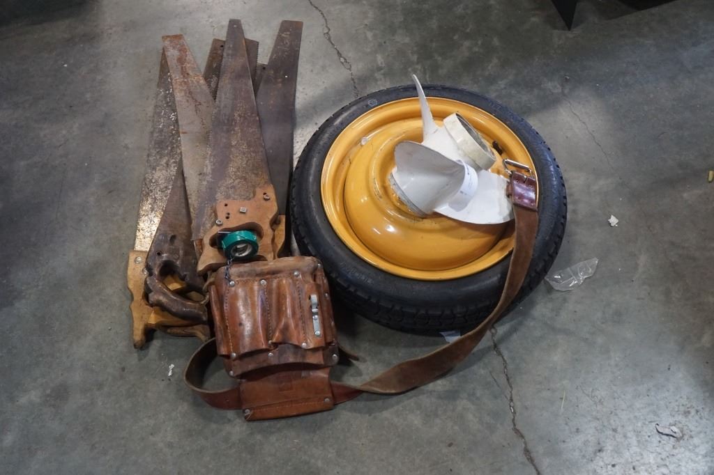 4 BOLT DOUGHNUT TIRE, WITH HANDSAWS, BOAT PROPELLER AND LEATHER TOOL SATCHEL