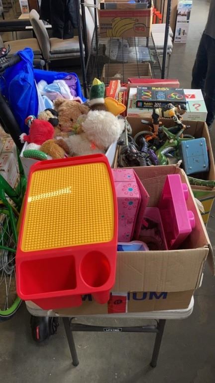 4 BOXES OF KIDS TOYS, COSTUMES, PUZZLES, ACTION FIGURES, STUFFED ANIMALS, DOG TOYS