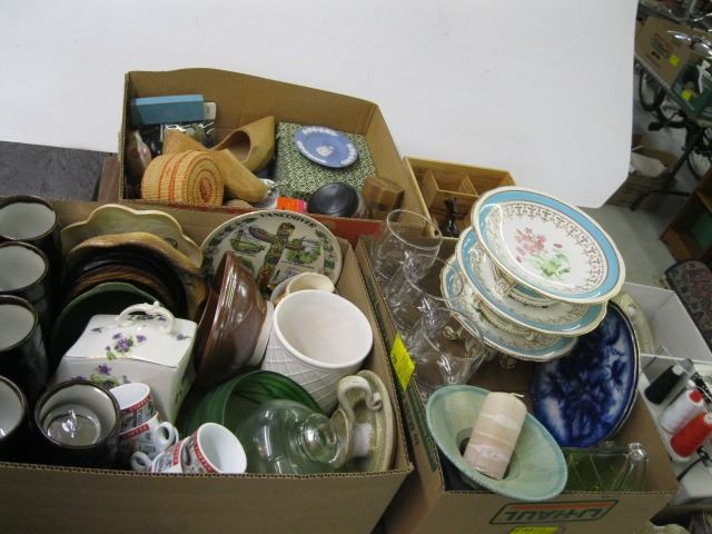 4 BOXES OF MISC. SMALL COLLECTABLES, POTTERY MUGS, PLATES, GLASSES, ETC.