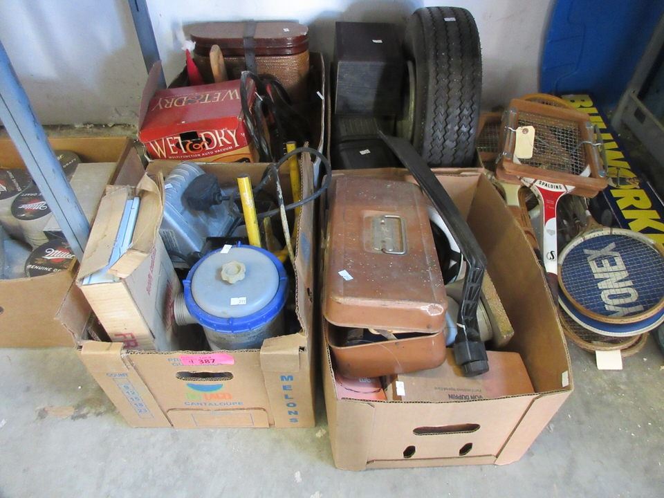 Wet/dry vac, pump, metal tool box, tire, emergency exit sign & more.