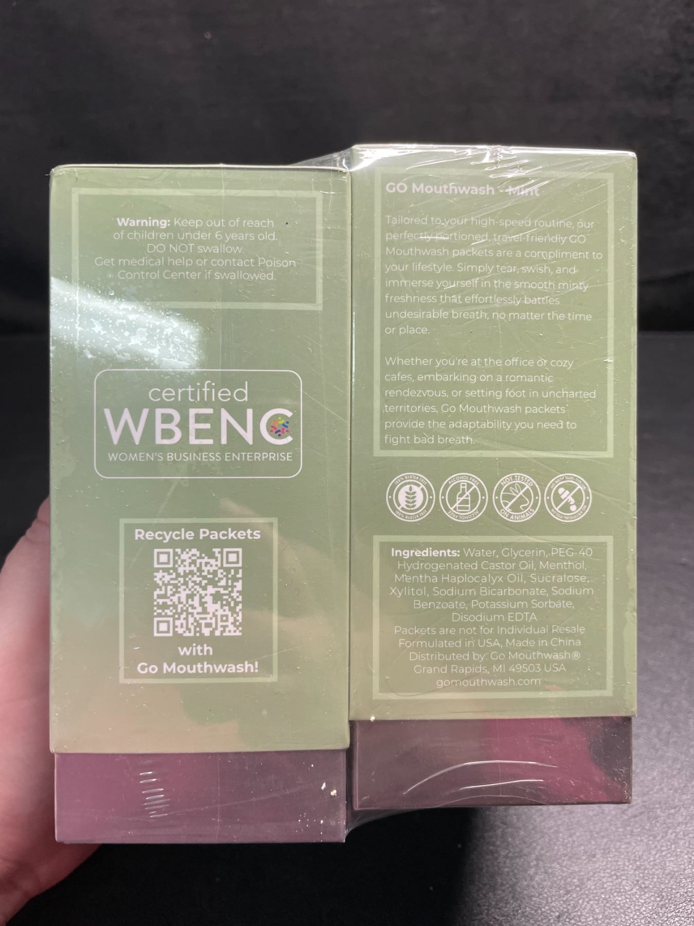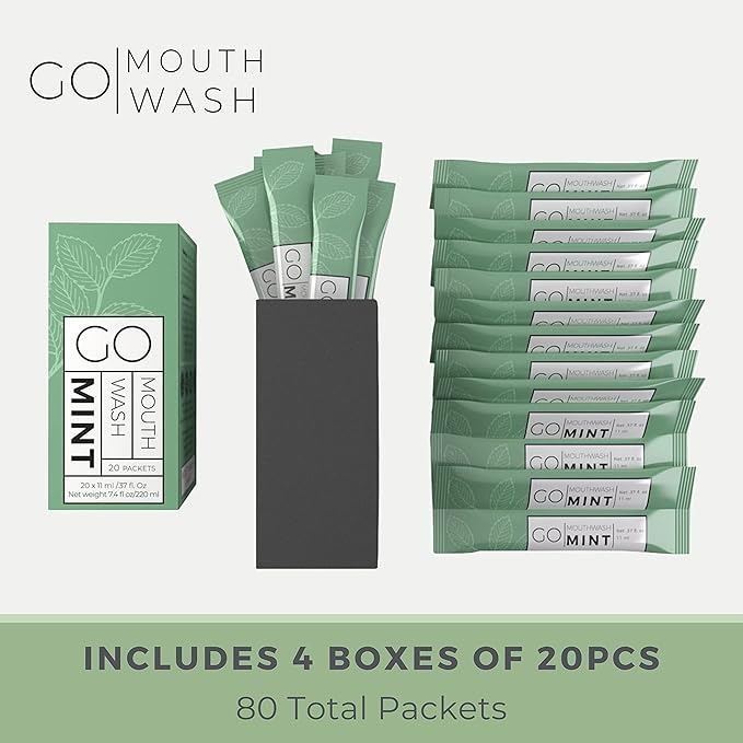 - GO Mouthwash - individual packets that are portable size. Travel mouthwash that freshens breath conveniently. Mint-flavored single-unit mouthwash. 80 individual stick packets. (Contains 4 boxes of 20 packets each - 80 Packets Total)