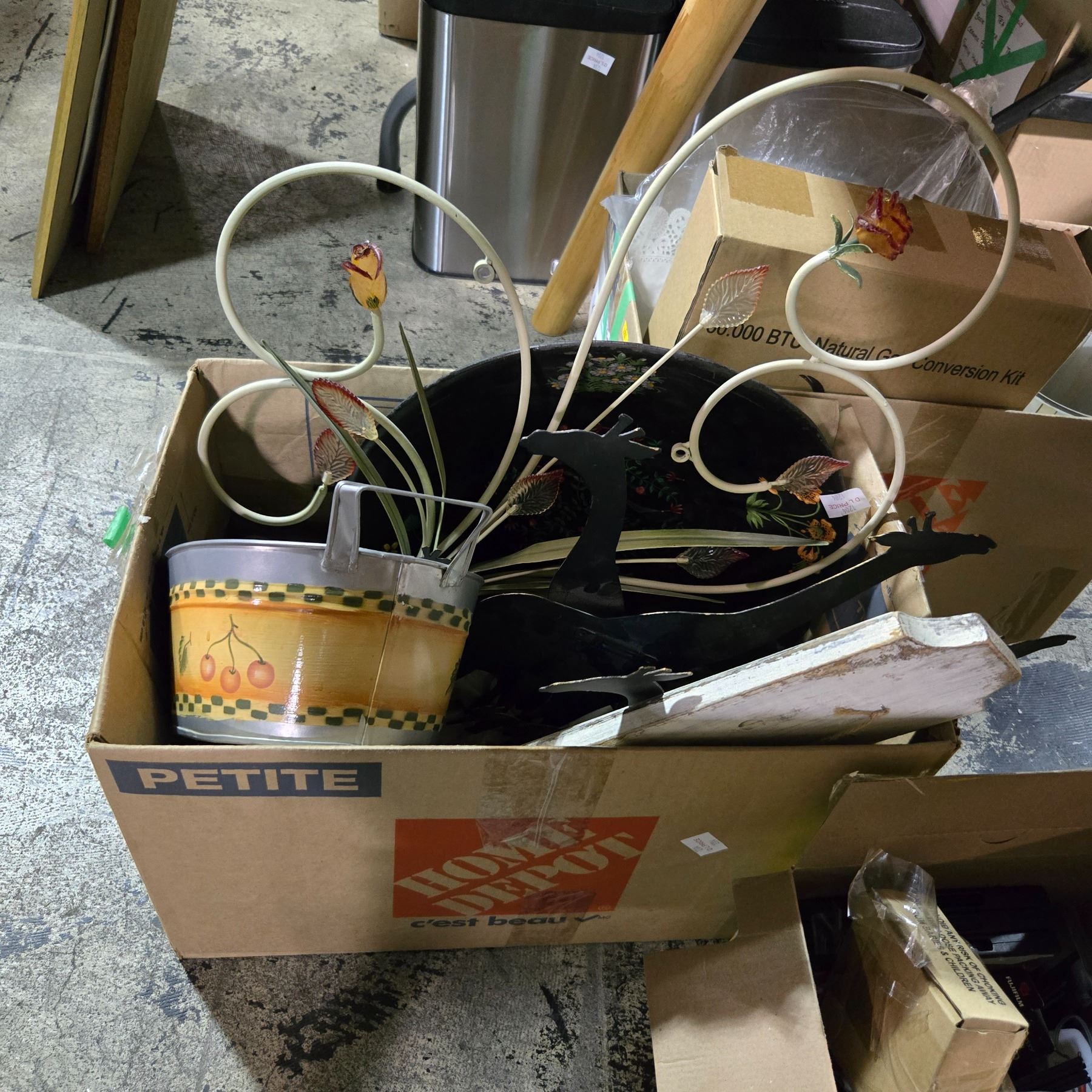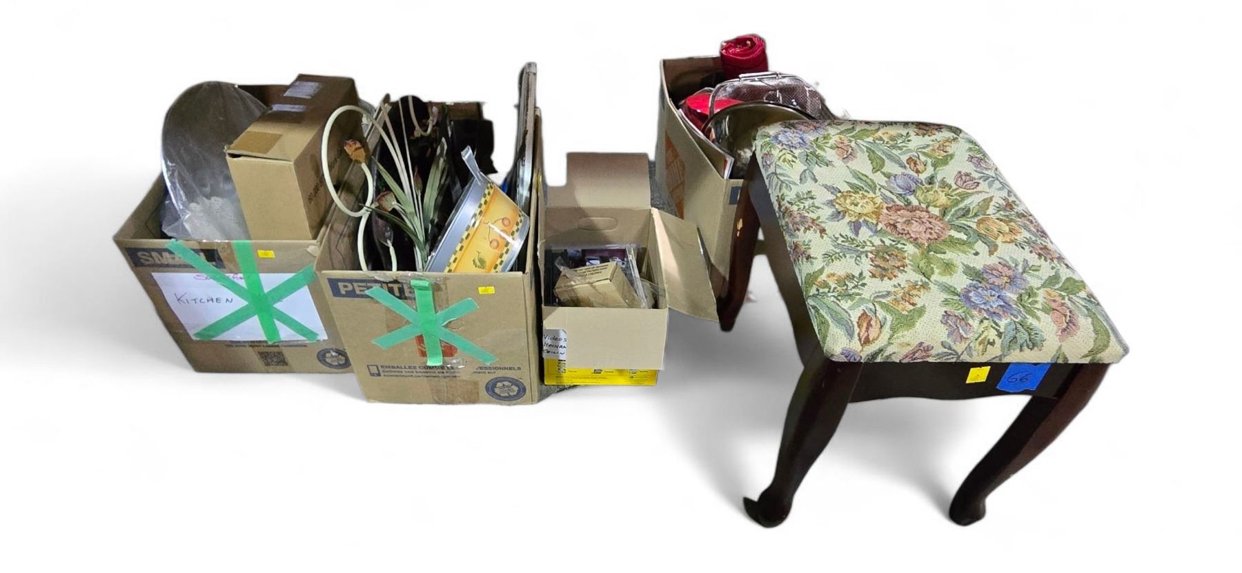 4 Boxes of Misc Household Items with Upholstered Footstool