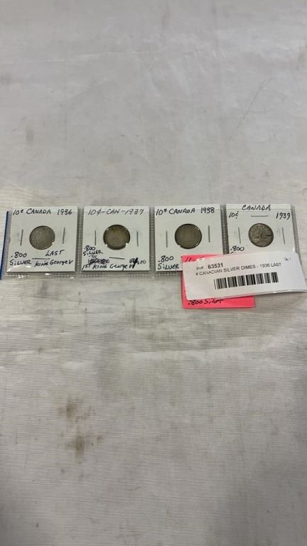 4 CANADIAN SILVER DIMES - 1936 LAST KNOWN GEORGE V, 1937 FIRST KING GEORGE VI, PLUS 1938, 1939 .800 SILVER