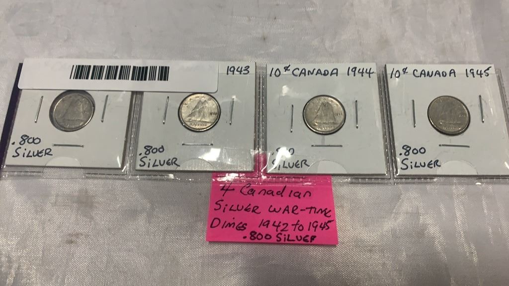 4 CANADIAN SILVER WAR-TIME DIMES 1942-1945 .800 SILVER