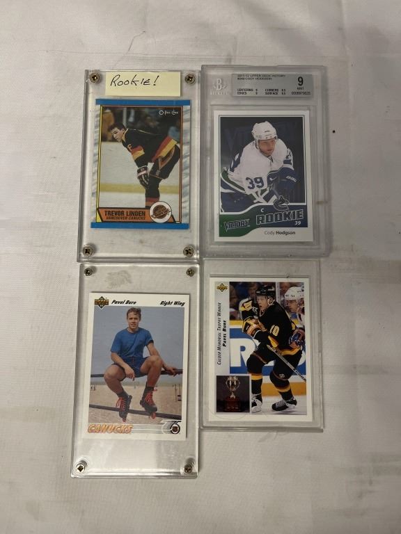 4 CANUCK CARDS, TREVOR LINDEN ROOKIE, CODY HODGSON ROOKIE, AND BURE