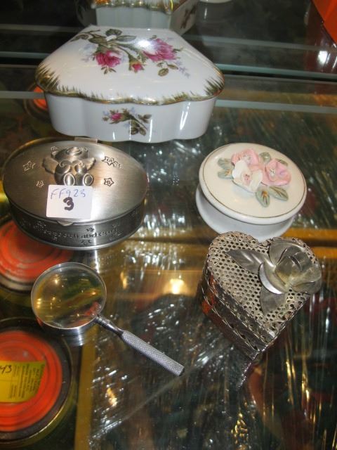 4 CERAMIC & METAL PILL BOXES & A SMALL MAGNIFYING GLASS