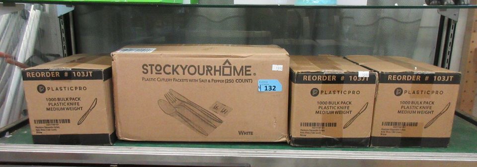 3 Cases of 1,000 medium weight plastic knives and 1 cases of 250 plastic cutlery sets with salt & pepper packets.