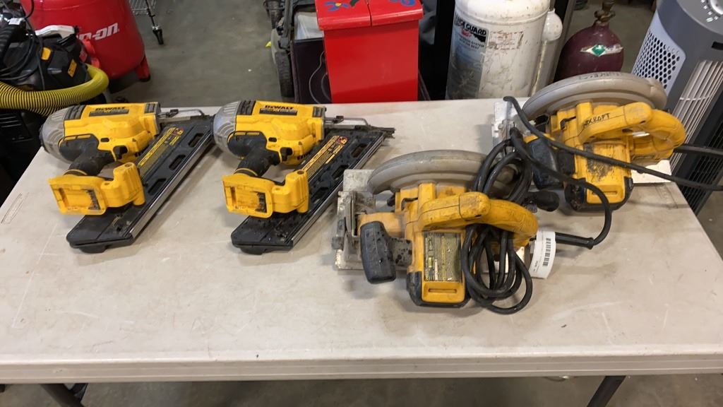 4 DEWALT TOOLS - 2 CIRCULAR SAWS, ONE WITH CUT CORD, 2 CORDLESS NAILERS,NO CHARGERS, NO BATTERIES