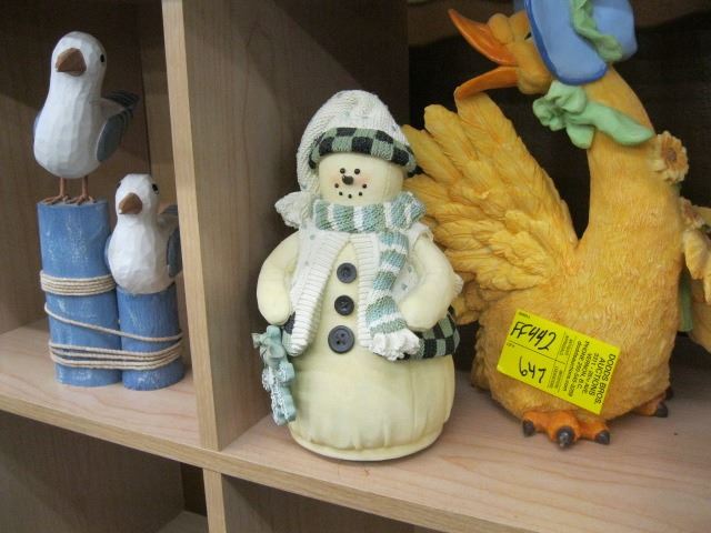 4 FIGURINES, DUCK, SLEEPING MAN, SNOWMAN, SEAGULLS
