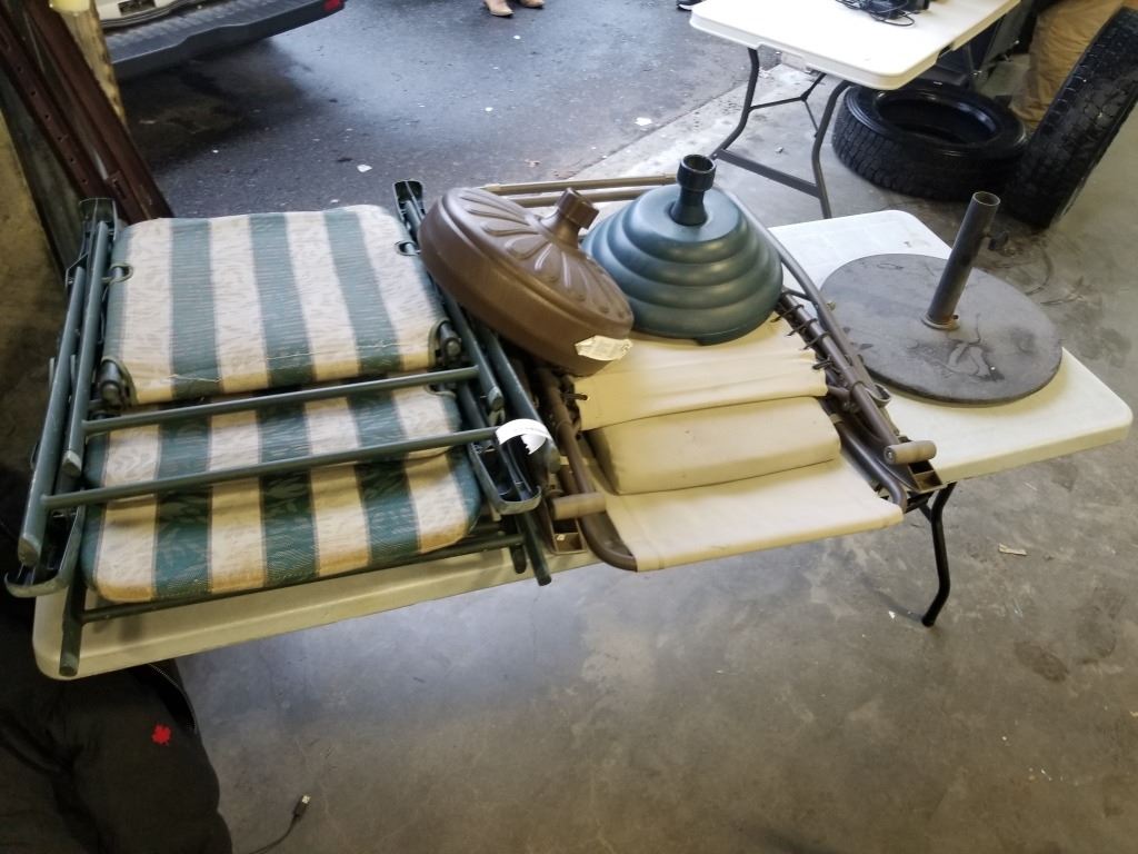 4 FOLDING PATIO CHAIRS, PATIO LOUNGER AND UMBRELLA STANDS