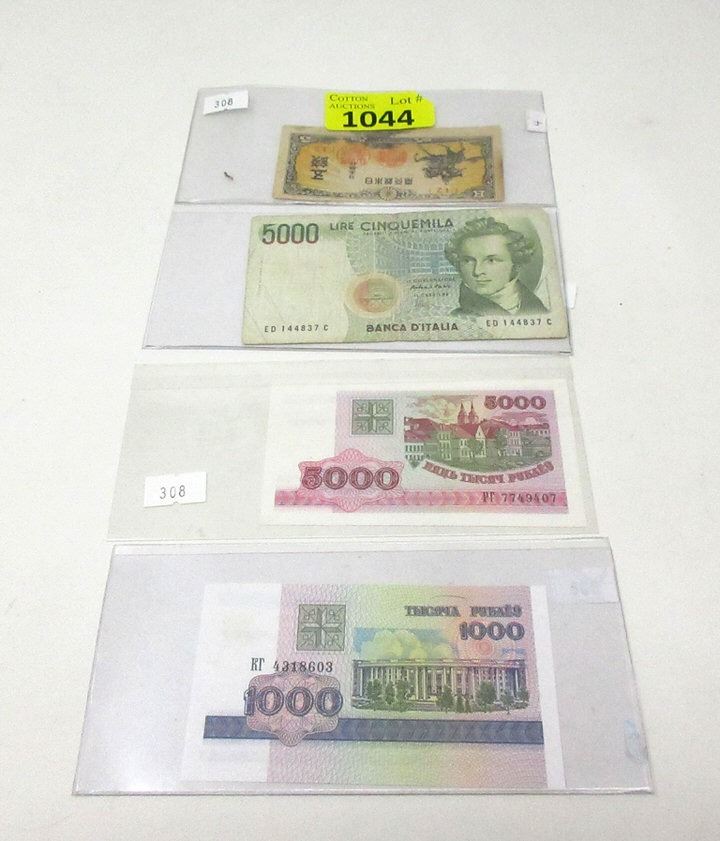 5000 Italian Lire, 5000 Belarus Ruble, 1000 Belarus Ruble and Japanese 5 Sen banknote.