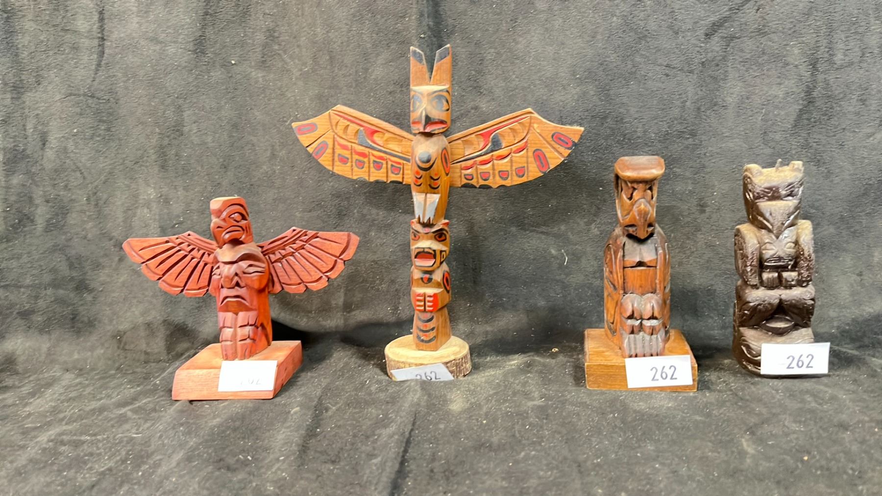 4 HAND CARVED FIRST NATIONS TOTEM POLES BY VARIOUS ARTISTS "EAGLE" BY RALPH WILLIAMS 5" X 6.5"