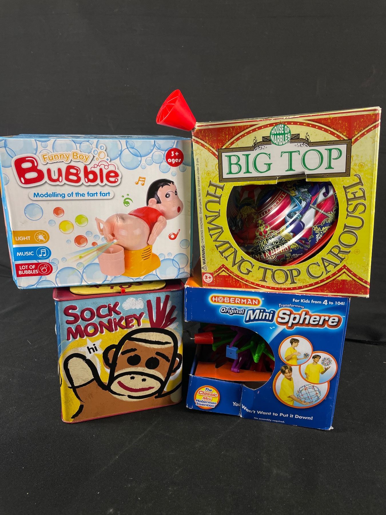 4 Interactive Toys - Funny Boy Bubble, Original Mini Sphere, Sock Monkey and You & Spinning Big Top