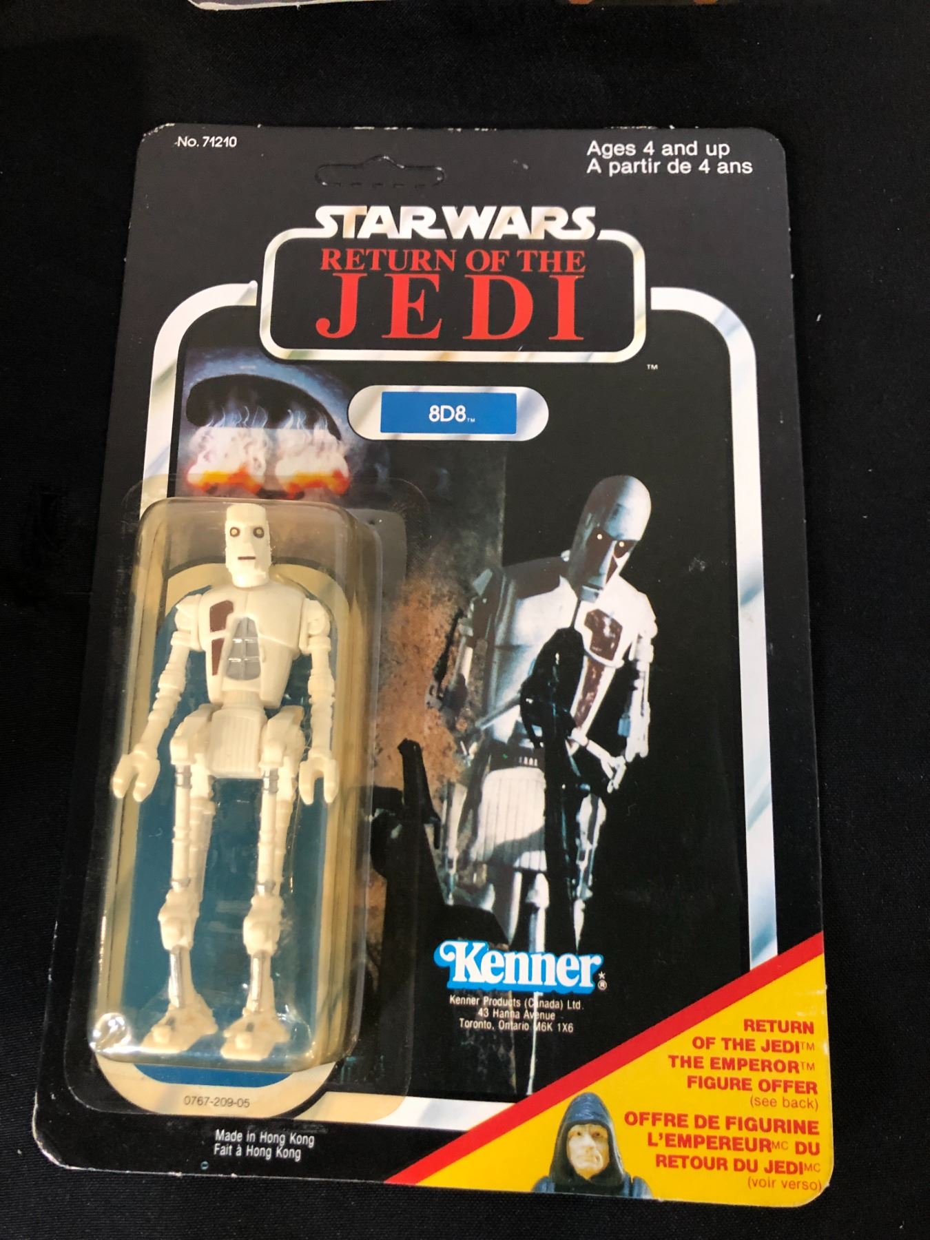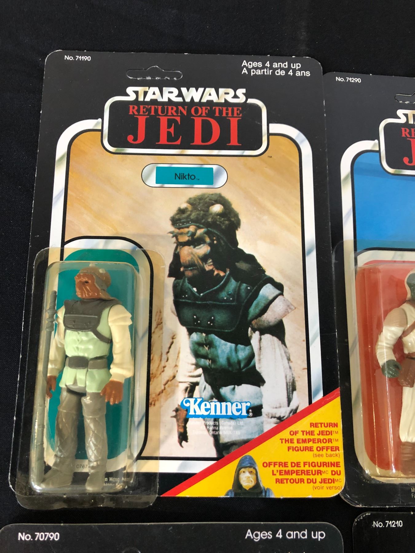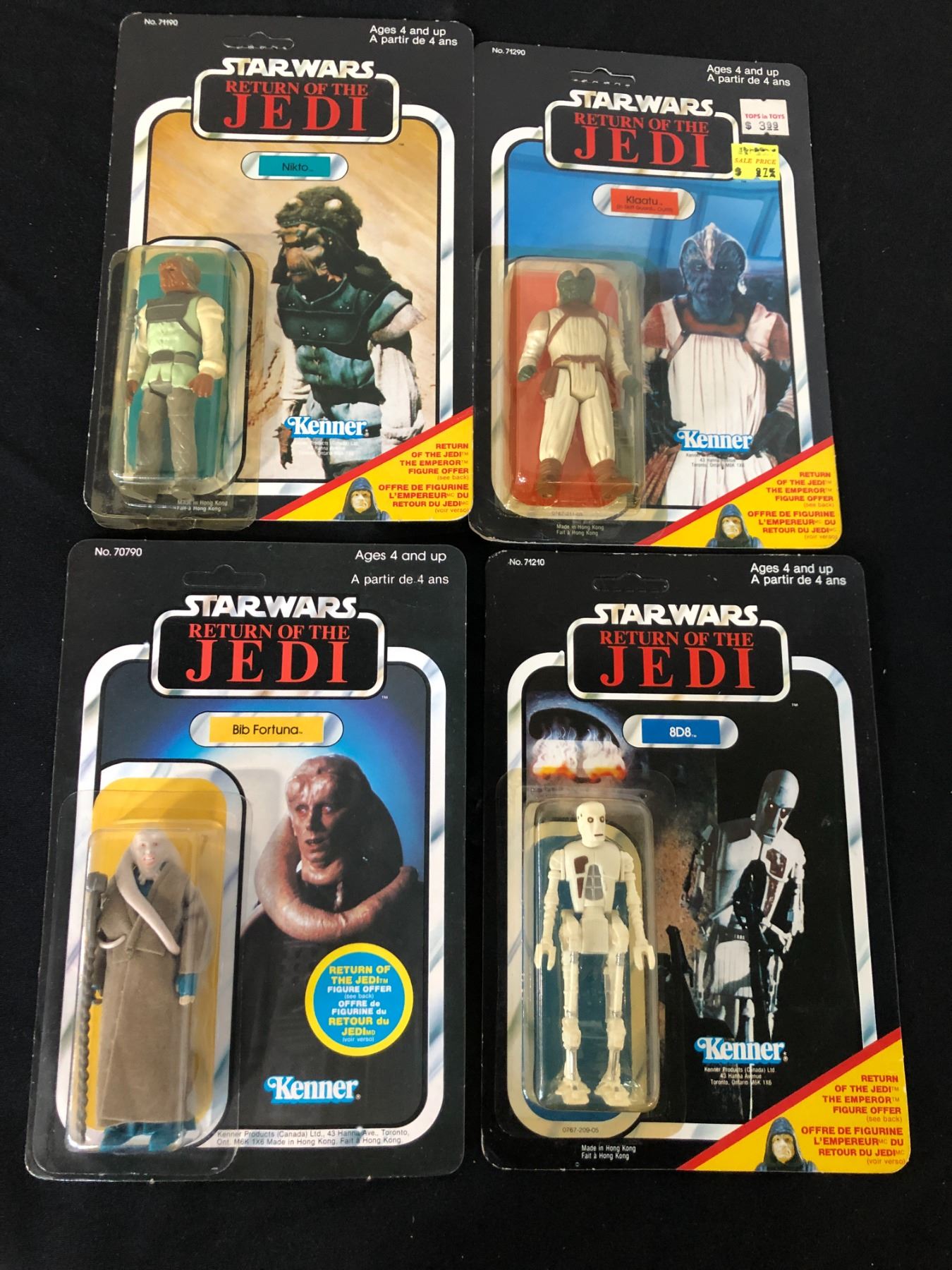 4 KENNER CANADA STARWARS RETURN OF THE JEDI ACTION FIGURES INCLUDING NO. 71210 8D8 SEALED IN BOX, NO. 71190 NIKTO SEALED IN BOX, NO. 71290 KLAATU (IN SKIFF GUARD OUTFIT) SEALED IN BOX, AND NO. 70790 BIB FORTUNA SEALED IN BOX