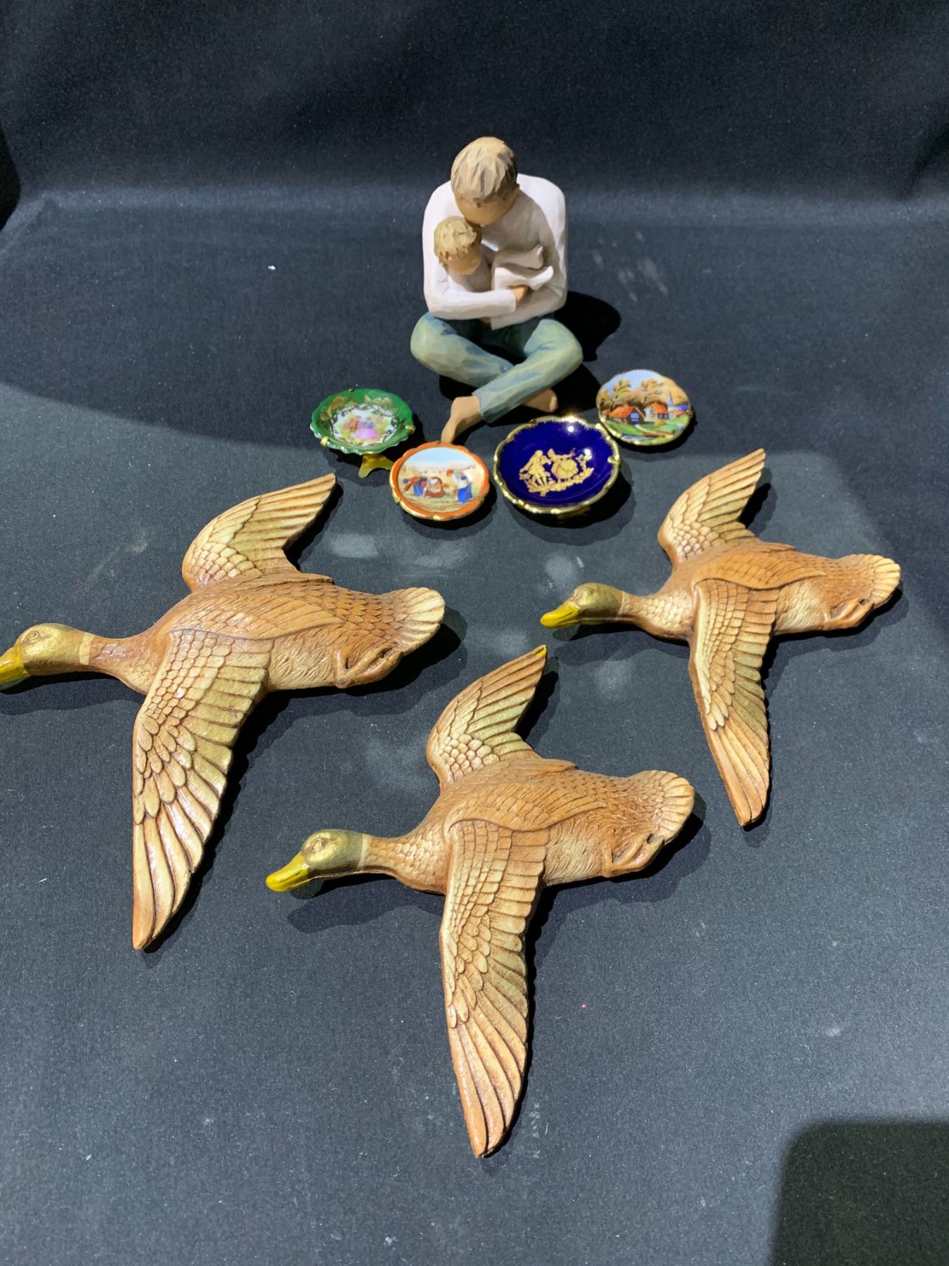 4 LIMOGES MINIATURE PLATES, 3 WOODEN DUCKS WALL DECOR & WILLOW TREE "LITTLE ONE" FIGURE APPROX 4"