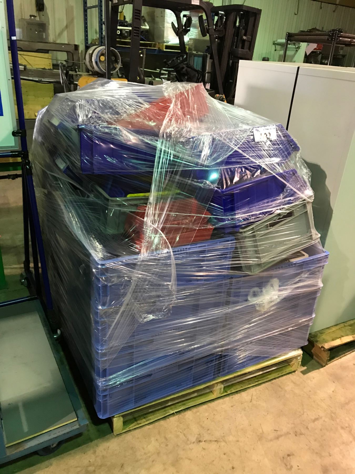 4 MOBILE PARTS BIN RACKS, PALLET OF PARTS BINS & MOBILE WHITE BOARD