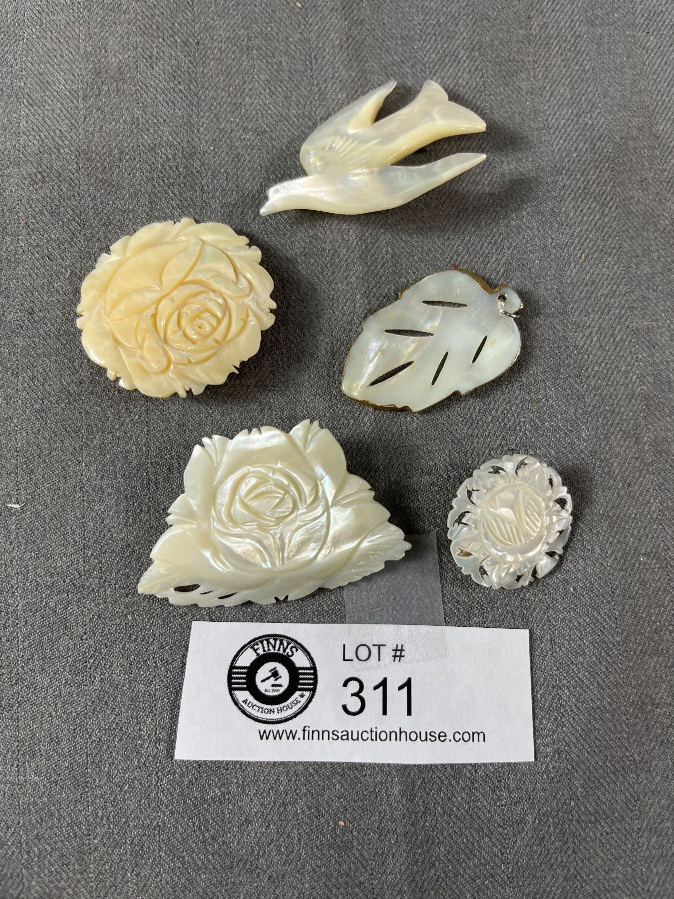 4 Mother Of Pearl Brooches & 1 Gold Embossed Pendant