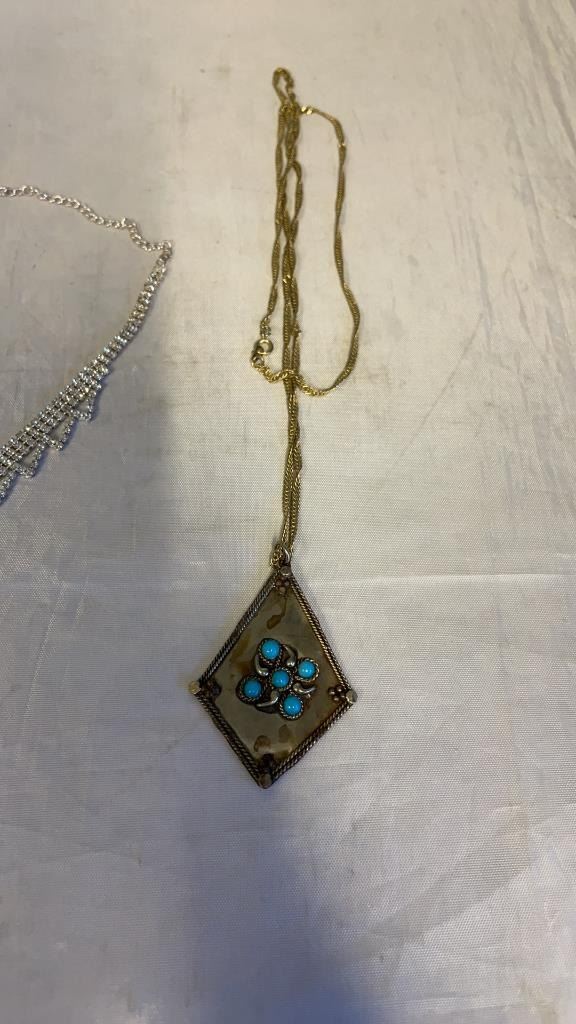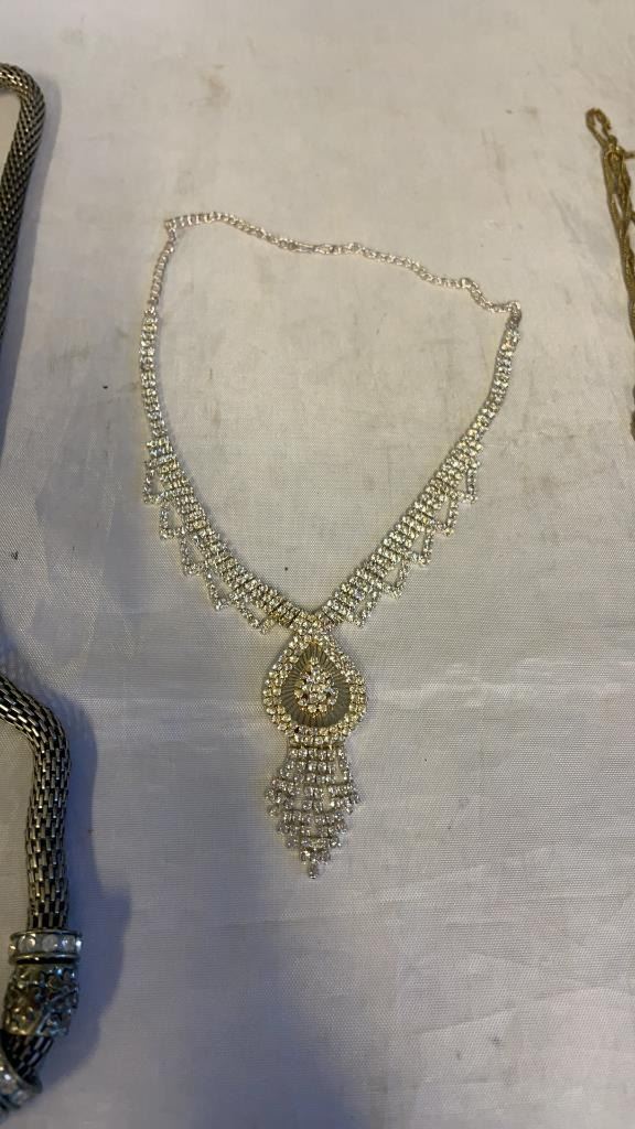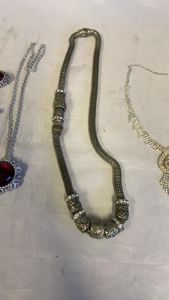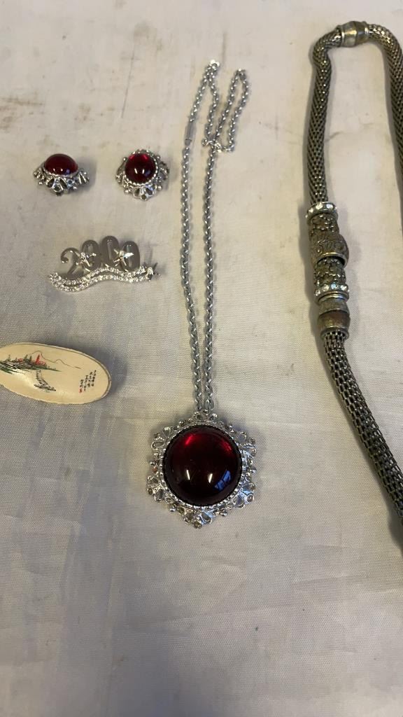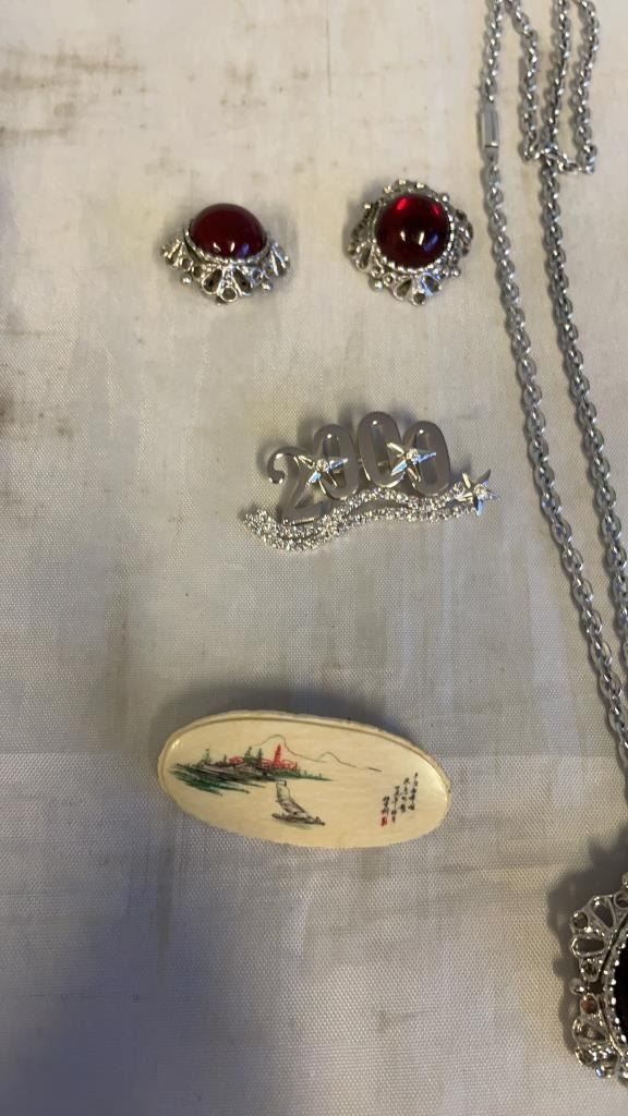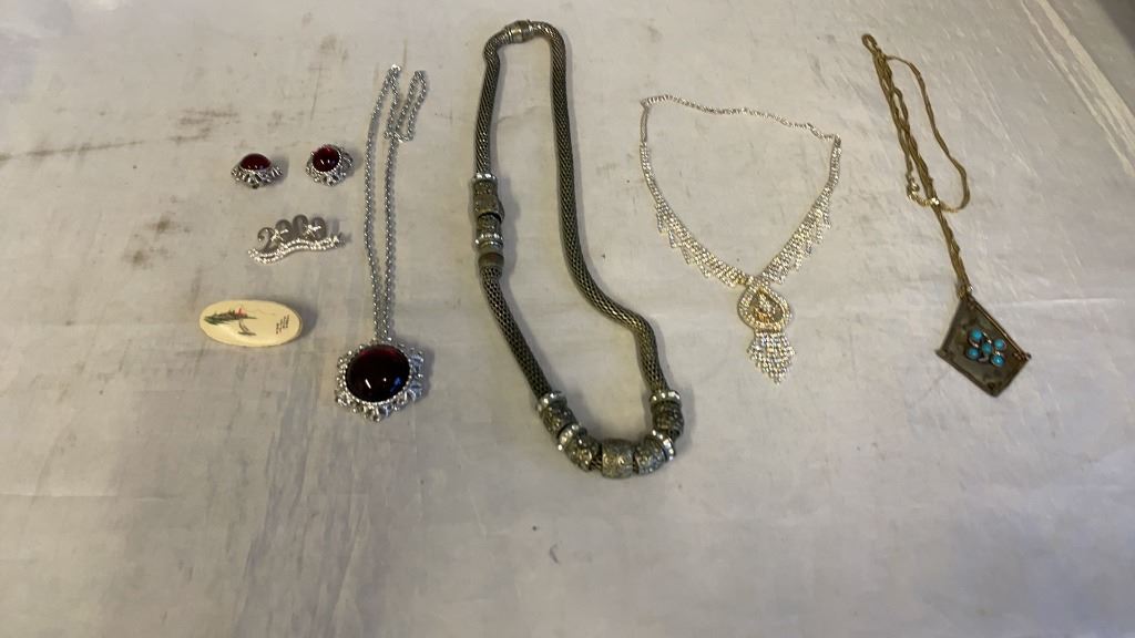 4 NECKLACES, 2 PINS, AND ONE PAIR CLIP ON EARRINGS