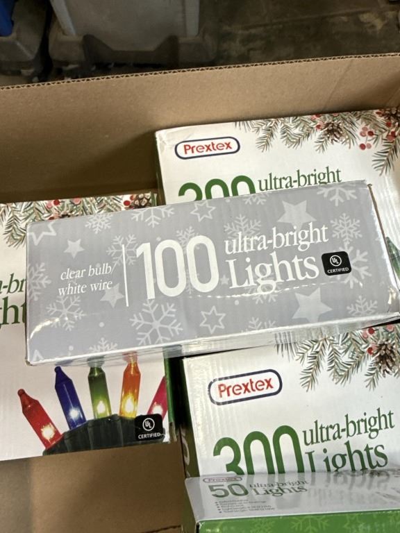 4 NEW 300 LIGHT 30FT ULTRA BRIGHT INDOOR OUTDOOR MULTI COLOR CHRISTMASS LIGHT SETS, 4 NEW 50 LIGHT 10FT CLEAR BULB SETS, AND ONE 100 LIGHT 20FT CLEAR BULB WHITE WIRE SET, ALL ARE CONNECTABLE