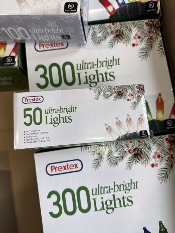 4 NEW 300 LIGHT 30FT ULTRA BRIGHT INDOOR OUTDOOR MULTI COLOR CHRISTMASS LIGHT SETS, 4 NEW 50 LIGHT 10FT CLEAR BULB SETS, AND ONE 100 LIGHT 20FT CLEAR BULB WHITE WIRE SET, ALL ARE CONNECTABLE