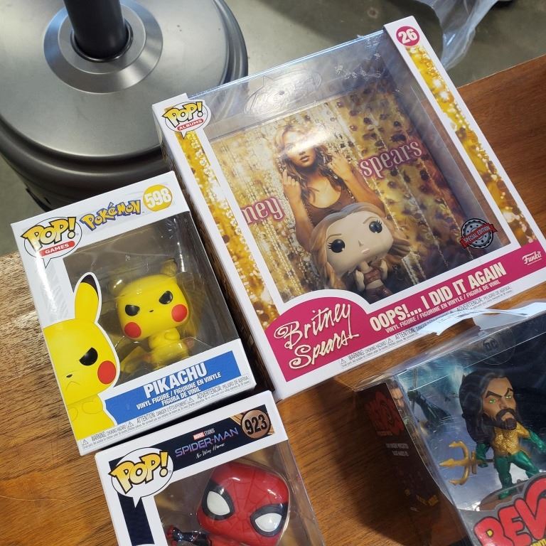 4 NEW COLLECTIBLE POP FIGURES, INCLUDING BRITNEY SPEARS AND PIKACHU, SPIDERMAN AND REVOS AQUAMAN