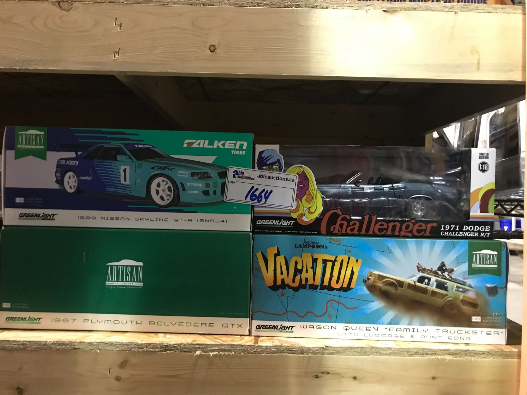 4 NEW IN BOX MODEL CARS: 1999 SKYLINE GT-R, 1971 CHALLENGER R/T, WAGON QUEEN FAMILY TRUCKSTER, 1967 BELVEDERE GTX