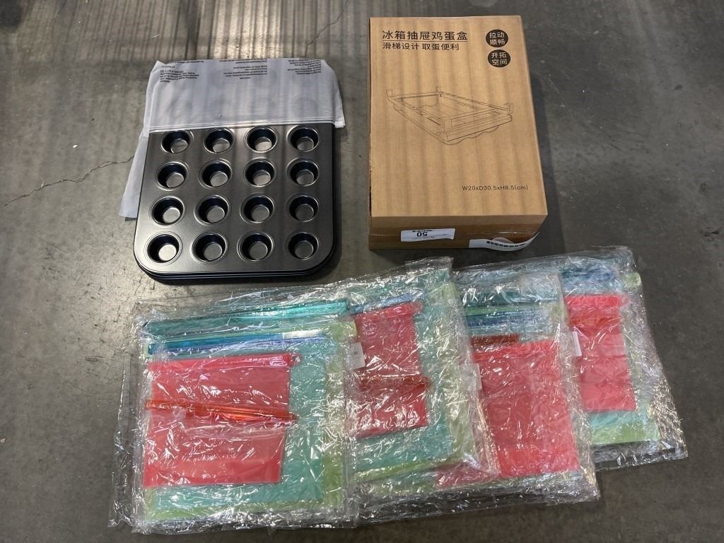 4 NEW SETS OF 3 SILICONE FOOD STORAGE LUNCH BAGS, RESEALABLE, NEW FRIDGE MOUNT EGG HOLDER AND MUFFIN / CUPCAKE TRAY