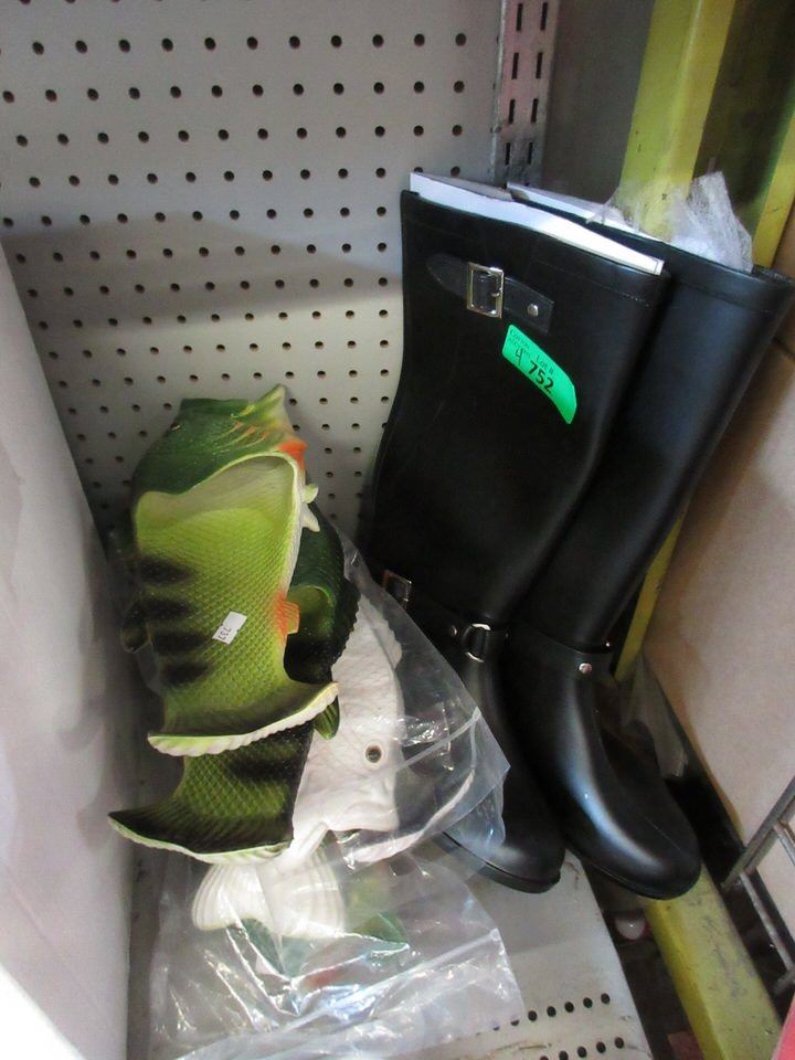 Ladies size 9 knee high rubber boots and 3 pairs of mens' size 10 fish sandles
