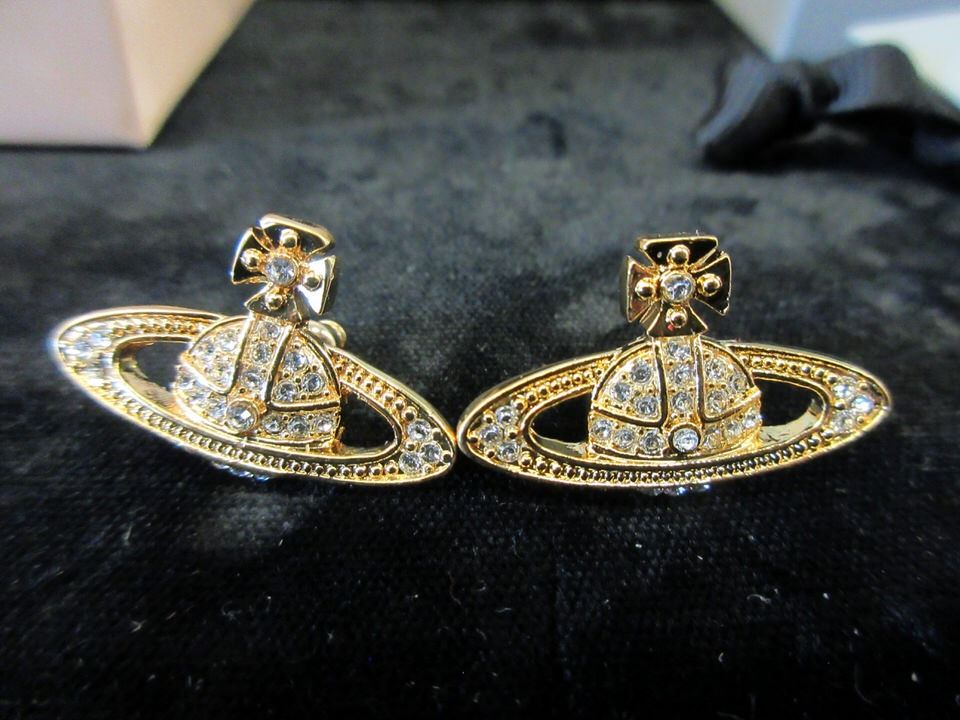 Gold tone crystal inset flat back sovereign orb earrings. 1.6 x 2.5 cm post back earrings. Includes cloth bags, boxes, and gift bags. Not authenticated.