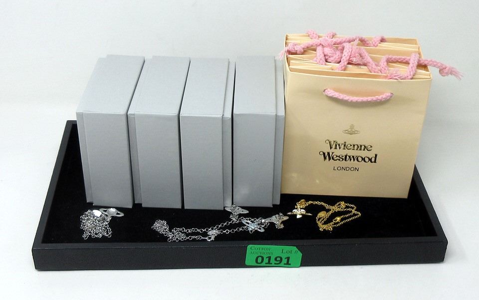 2 Chokers, 1 necklace and a pair of earrings. Each is complete with bonus key chain, designer bag, box, and polishing cloth.