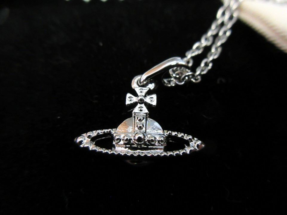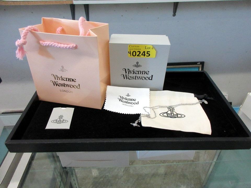 Silver tone bas relief pendant measures 14.7 x mm and hangs on a 17" chain. Includes cloth bags, boxes, and gift bags. Not authenticated.