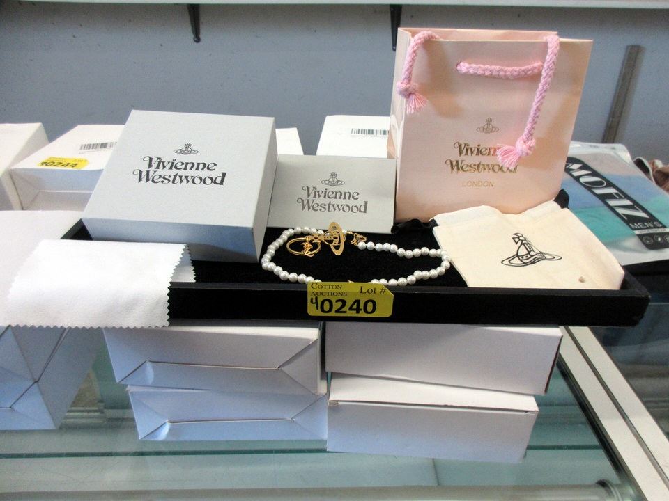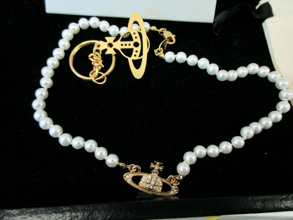 15" Necklace with 5.4 mm pearls and crystal set orb. Includes keychains, boxes, and gift bags. Not authenticated.