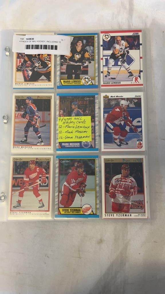 4 PAGES OF NHL HOCKEY; INCLUDING 12 CARDS LEMIEUX, 12 MESSIER, 12 YZERMAN