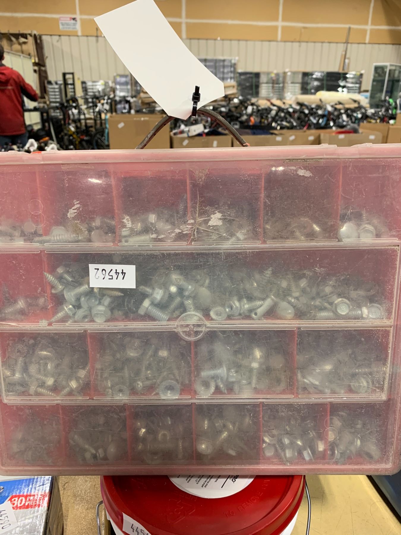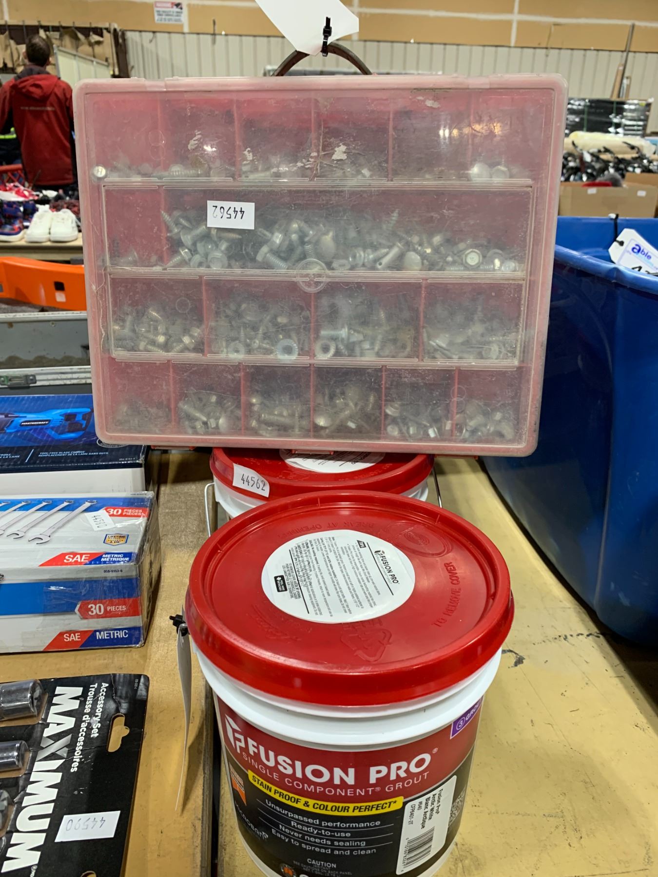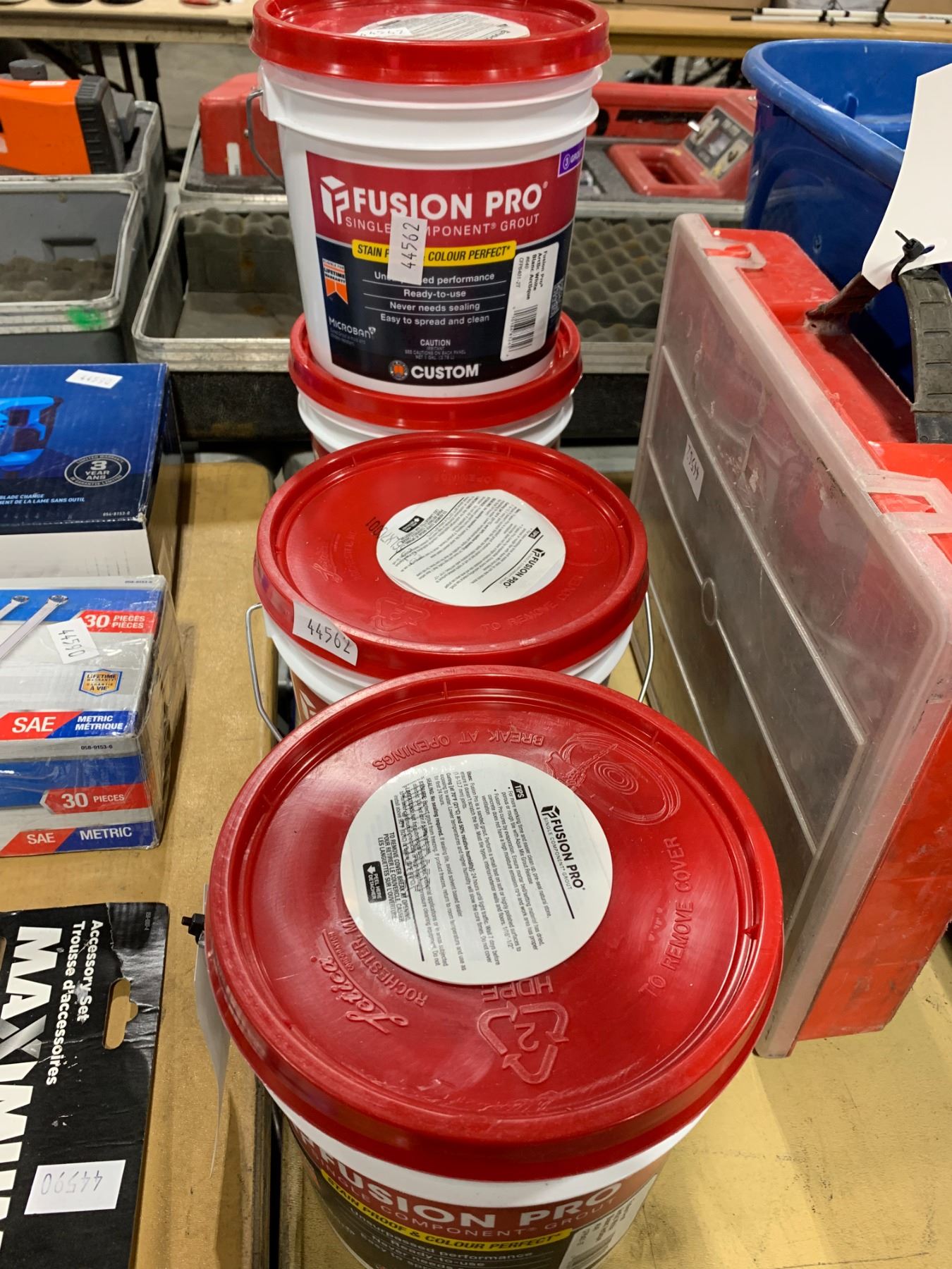 4 PALES FUSION PRO SINGLE COMPONENT GROUT AND A ORGANIZER CASE FILLED WITH ASSORTED HARDWARE
