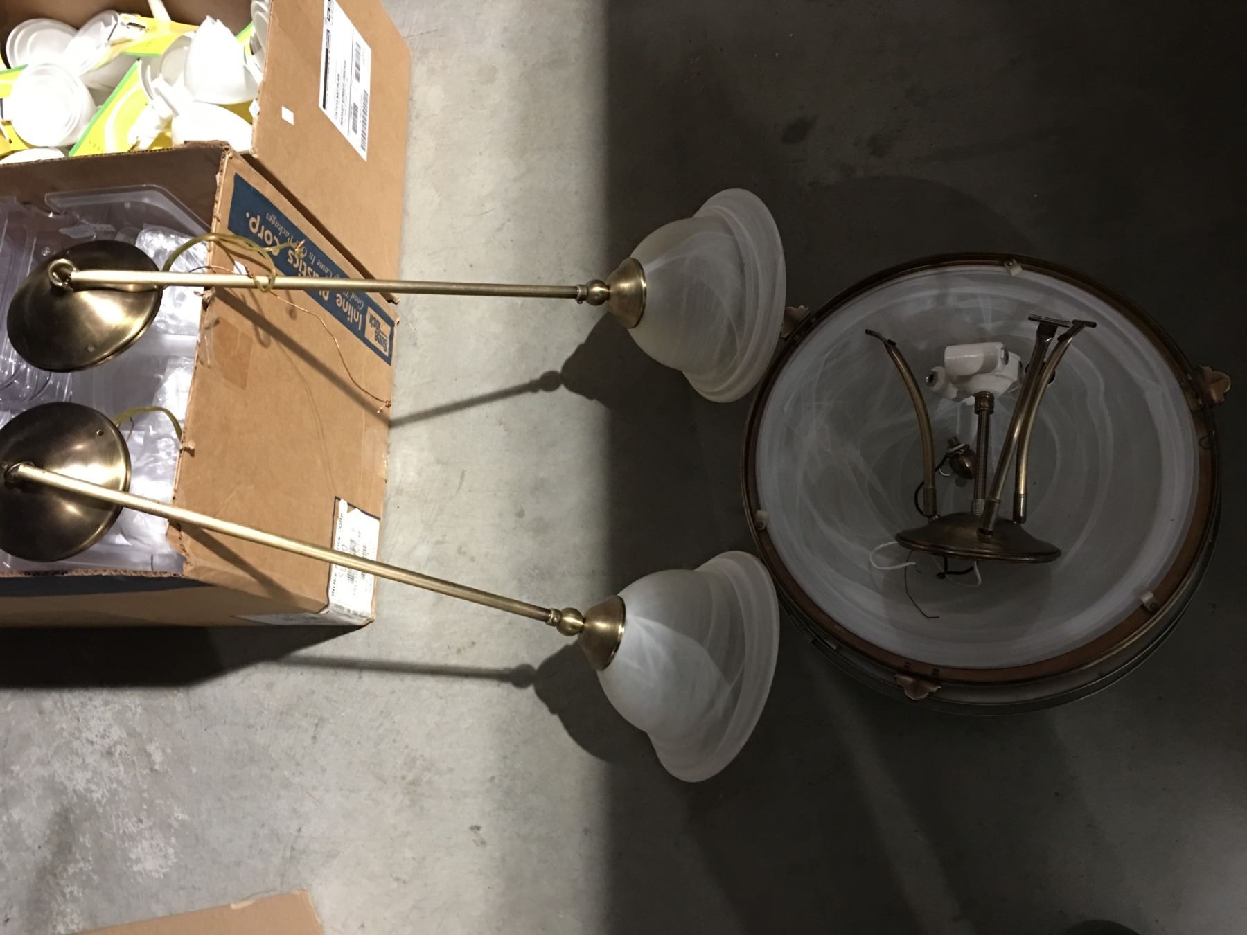4 PCE ELEGANT BRASS & FROSTED GLASS LIGHT SET, 2 DOME CEILING LIGHT FIXTURES & 2 HANGING LIGHT FIXTURES