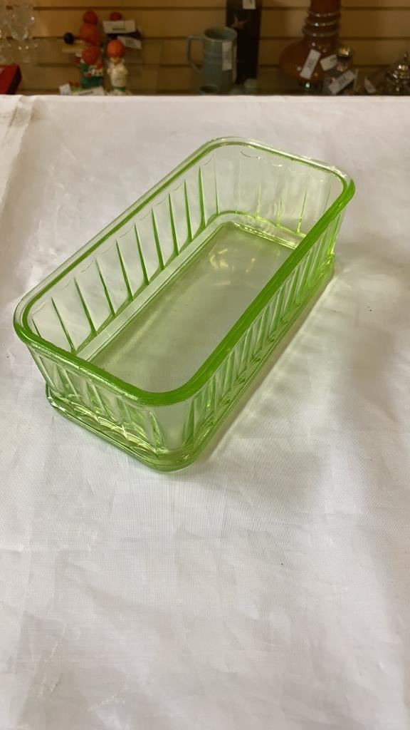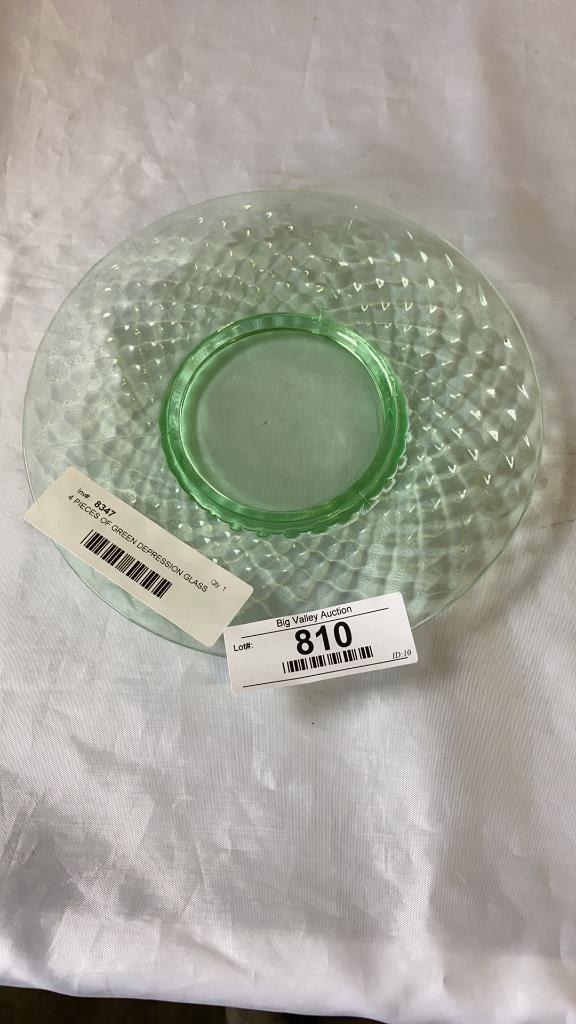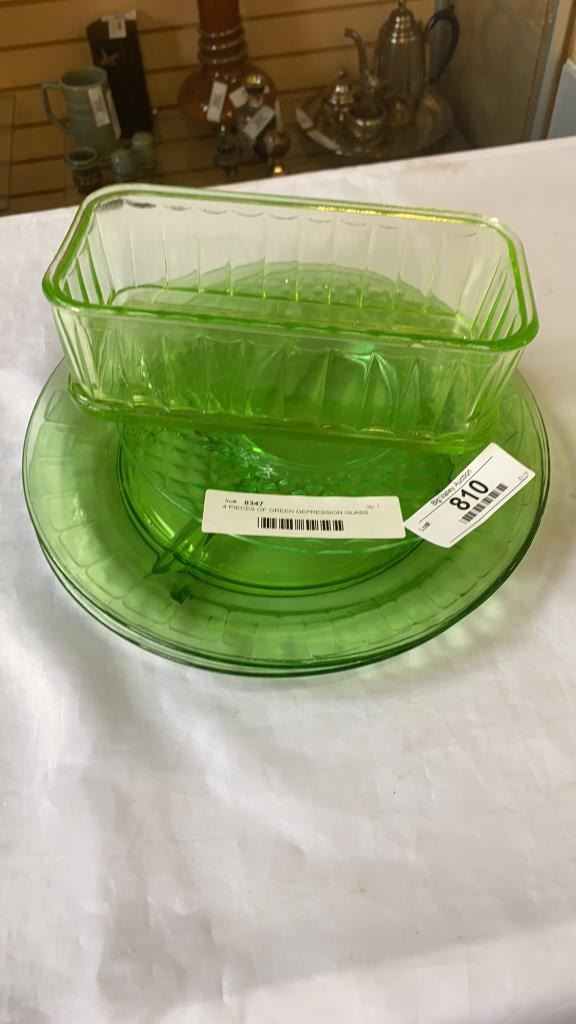 4 PIECES OF GREEN DEPRESSION GLASS PLATES