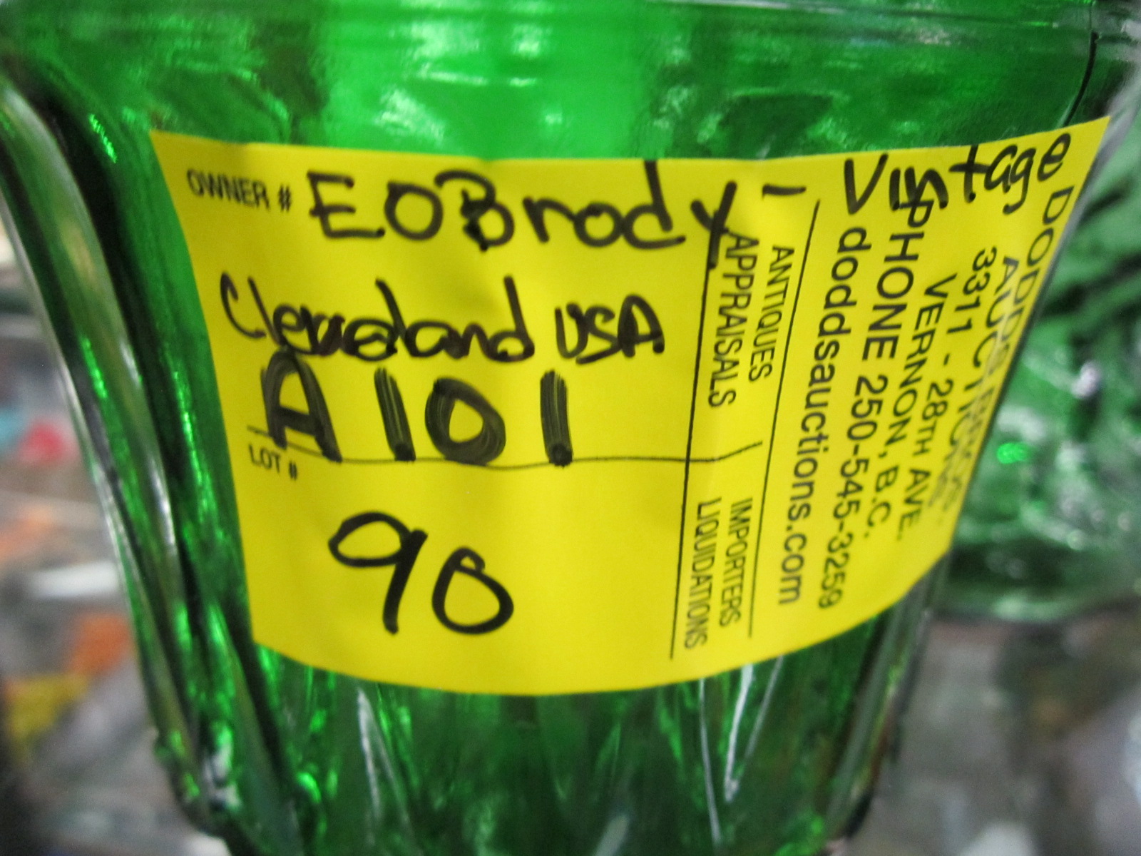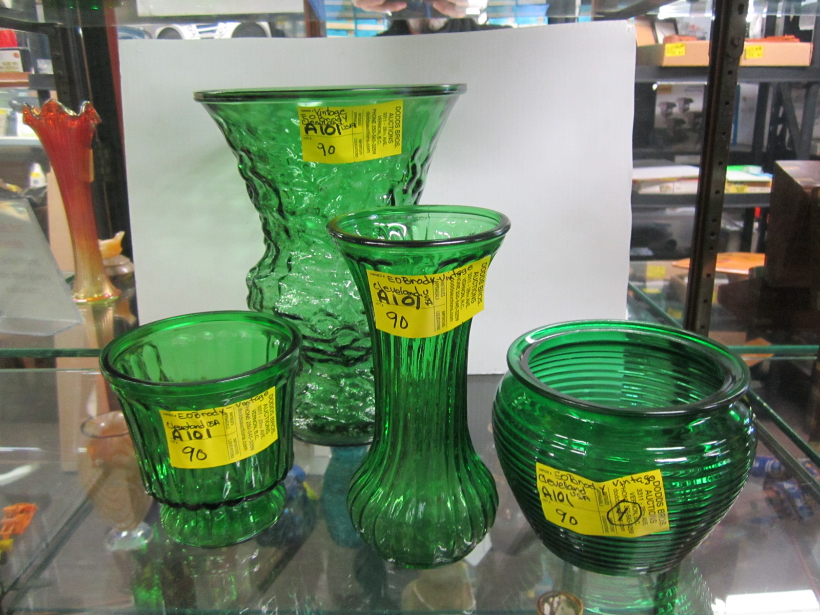4 PIECES OF GREEN E. BRODIE VINTAGE GLASS MADE IN CLEVELAND, USA