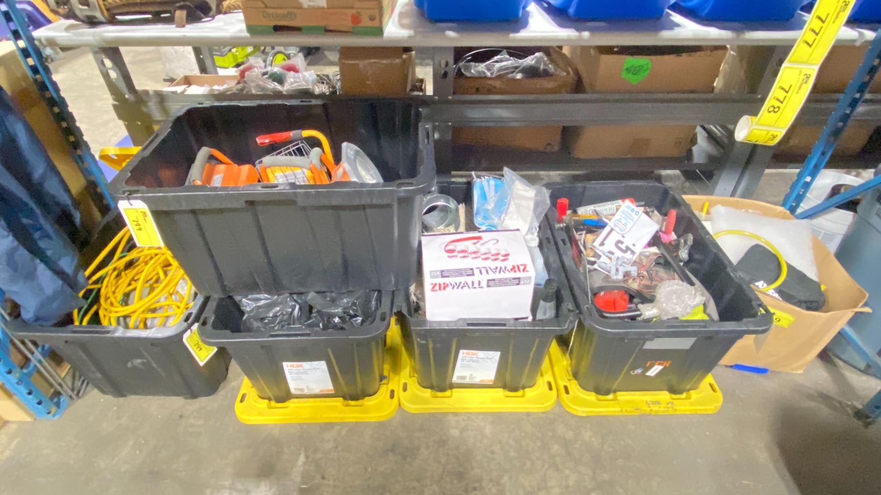 4 PLACK PLASTIC BINS OF ASSORTED HAND TOOLS, CLEANING SUPPLIES, VENTILATION TUBES, EXTENSION CORDS, HALOGEN WORK LIGHTS, & BOX OF FILTERS *PLASTIC BINS / LIDS INCLUDED*