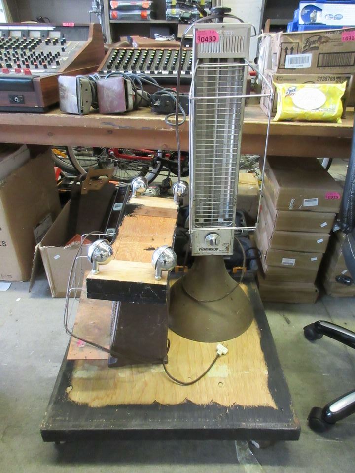 Original Boekamp quartz heater, small wood dolly, heater and wood on casters.