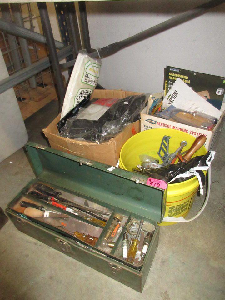 19" Metal tool box with contents, 2 boxes and a bucket of hand tools and accessories.