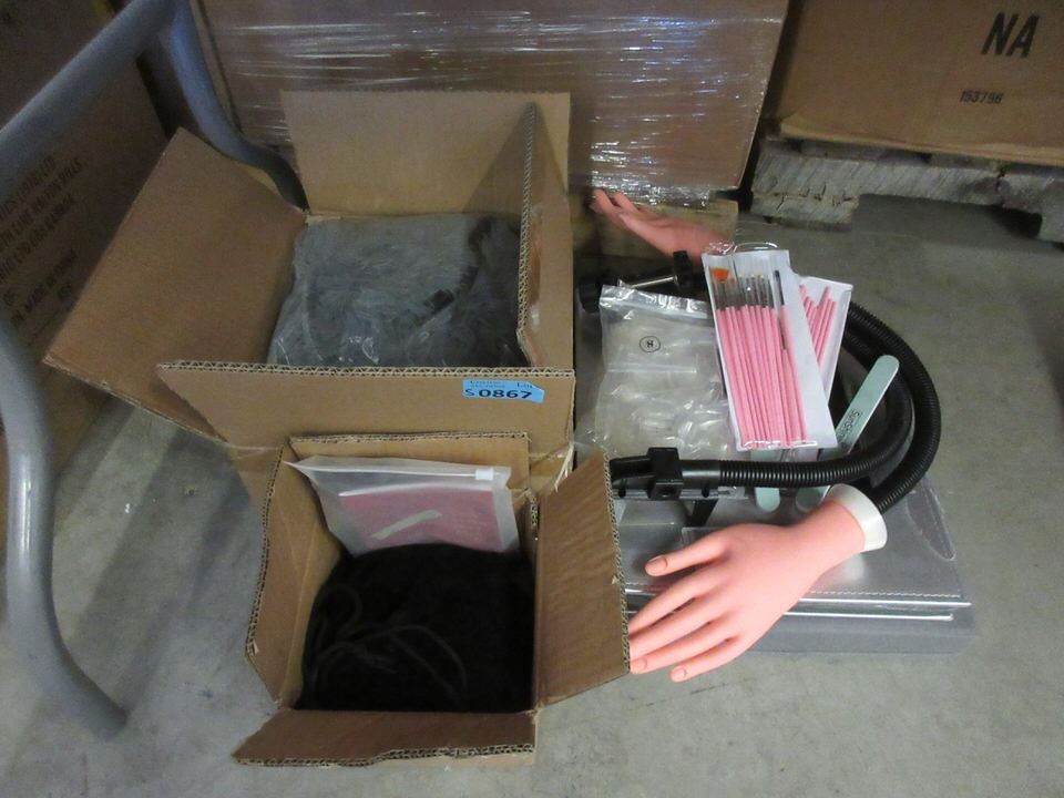 Manicure practice hands, binders, 7" steel tongue drum and small round pet bed.